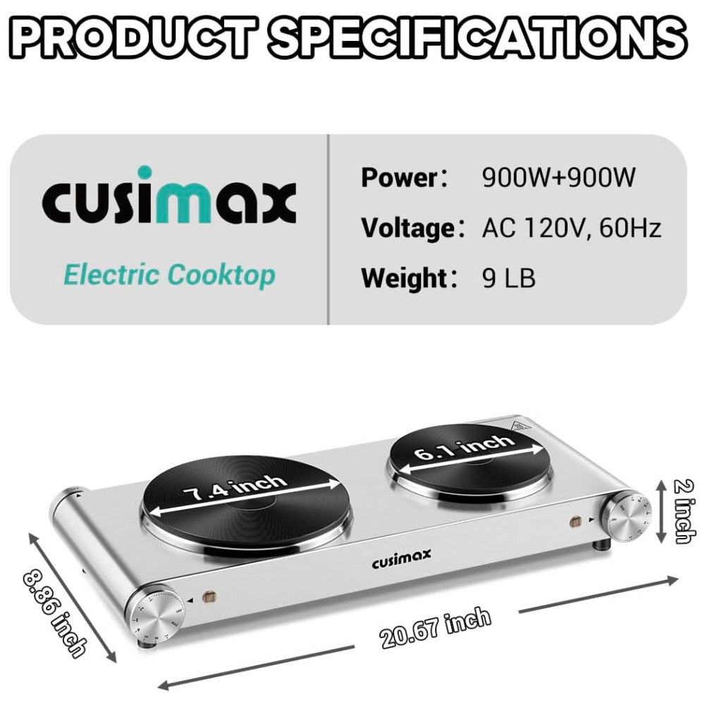 Compatível com Todos os Tipos de Utensílios de Cozinha: O Cooktop Elétrico CUSIMAX é adequado para todos os tipos de panelas. A placa de ferro fundido de alta qualidade é compatível com panelas de até 18,8 cm + 15,5 cm. Adequado para panelas de aço inoxidável, panelas de vidro, panelas de alumínio, frigideiras de ferro fundido ou panelas de cerâmica, etc., pode aquecer efetivamente os utensílios e reduzir a perda de calor.