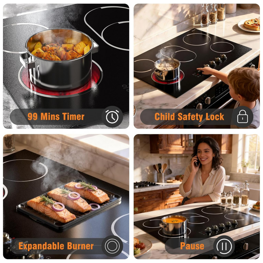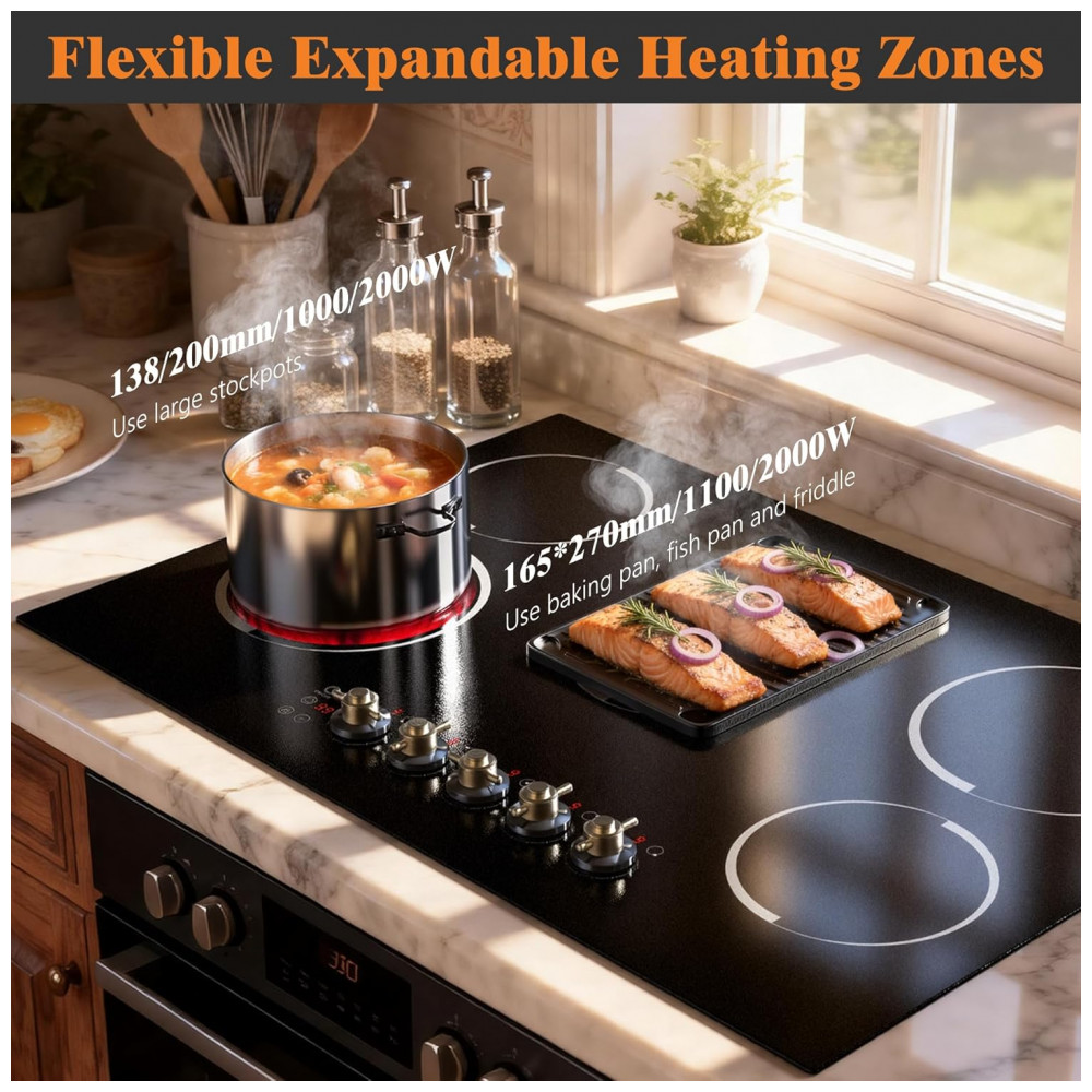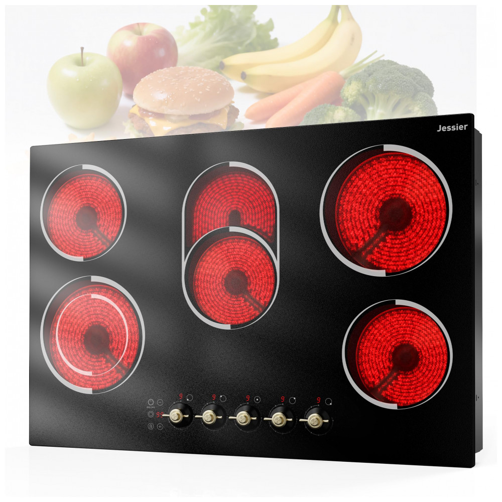 Cooktop elétrico de embutir 77 cm Jessier vitrocerâmico preto 5 zonas radiantes 8400W timer trava de segurança e zona dupla 220V