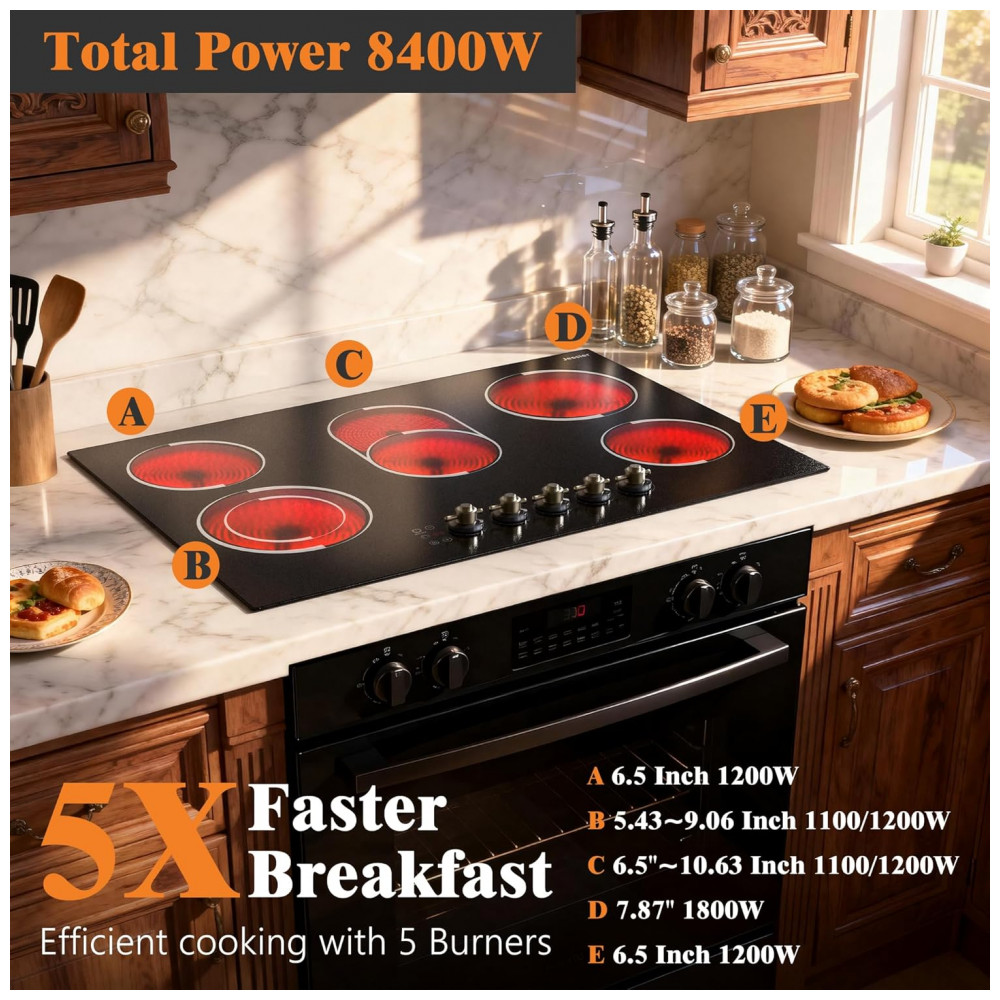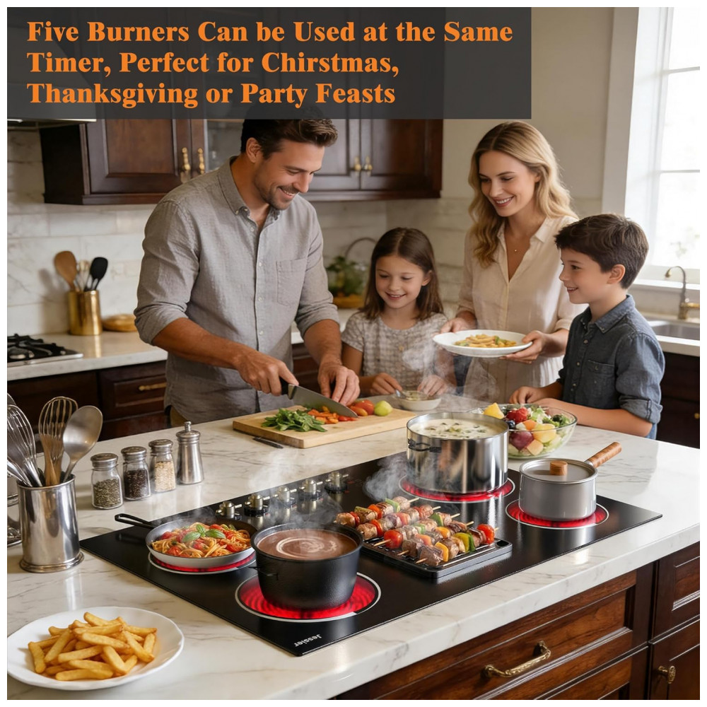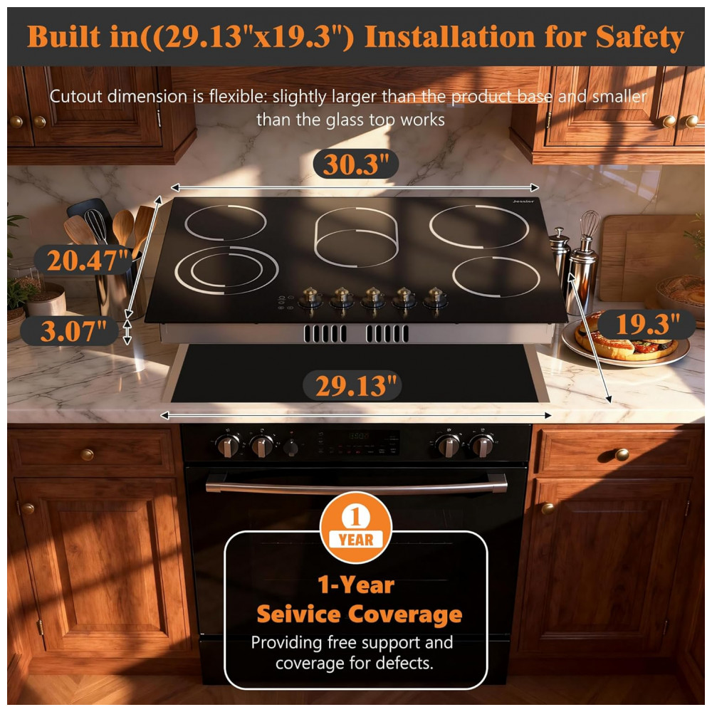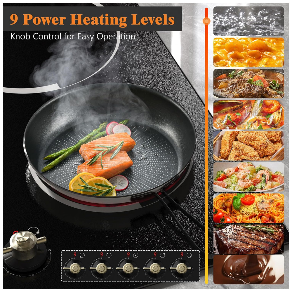 Cooktop elétrico de embutir 77 cm Jessier vitrocerâmico preto 5 zonas radiantes 8400W timer trava de segurança e zona dupla 220V