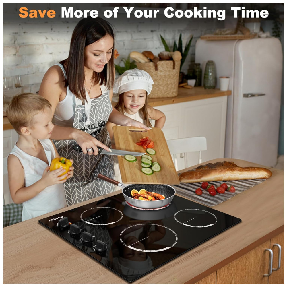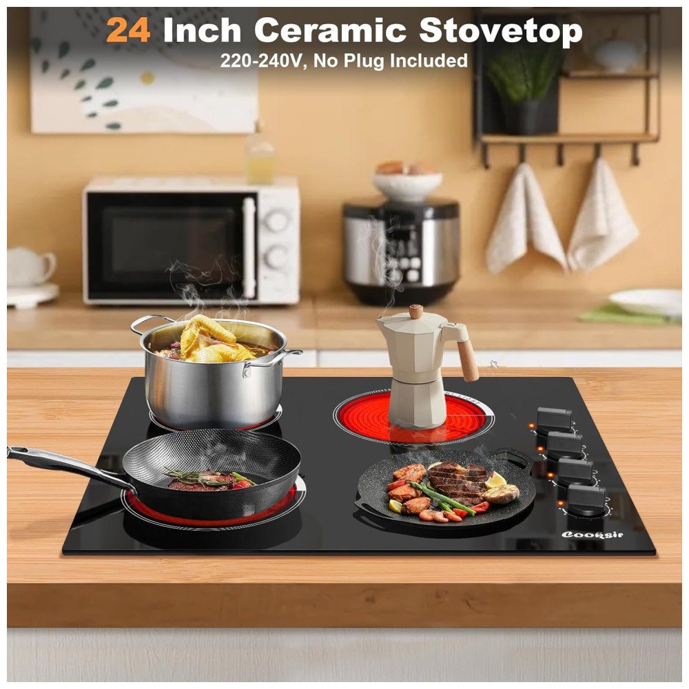 4 zonas de cozimento poderosas Esta placa de cozimento elétrica de 24 polegadas é adequada para AC220 240V, apresentando 4 zonas de cozimento diferentes com potência total de 6000W. As duas zonas redondas de cozimento de 6,5 têm uma potência máxima de 1200W, as duas zonas redondas de cozimento de 7,9 20 centímetros têm uma potência máxima de 1800W. O Hob cerâmico embutido 220 240v com fio rígido precisa de um eletricista profissional para a fiação.