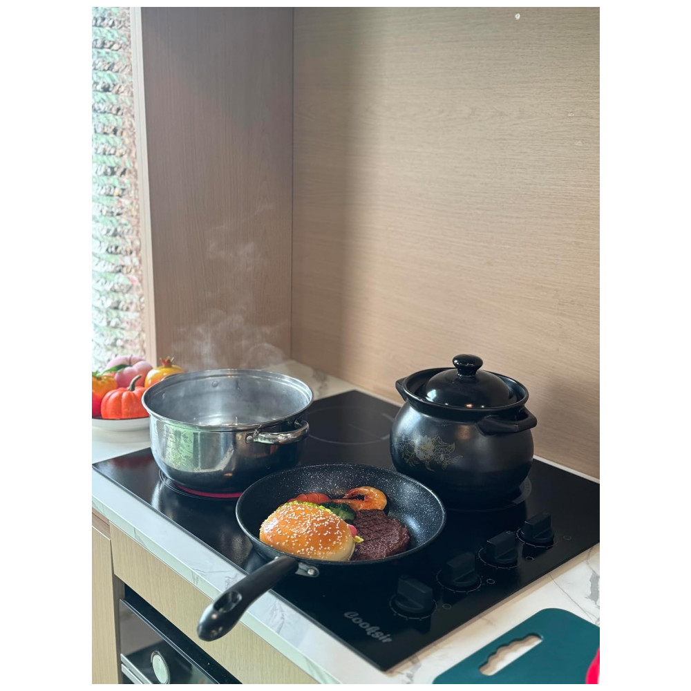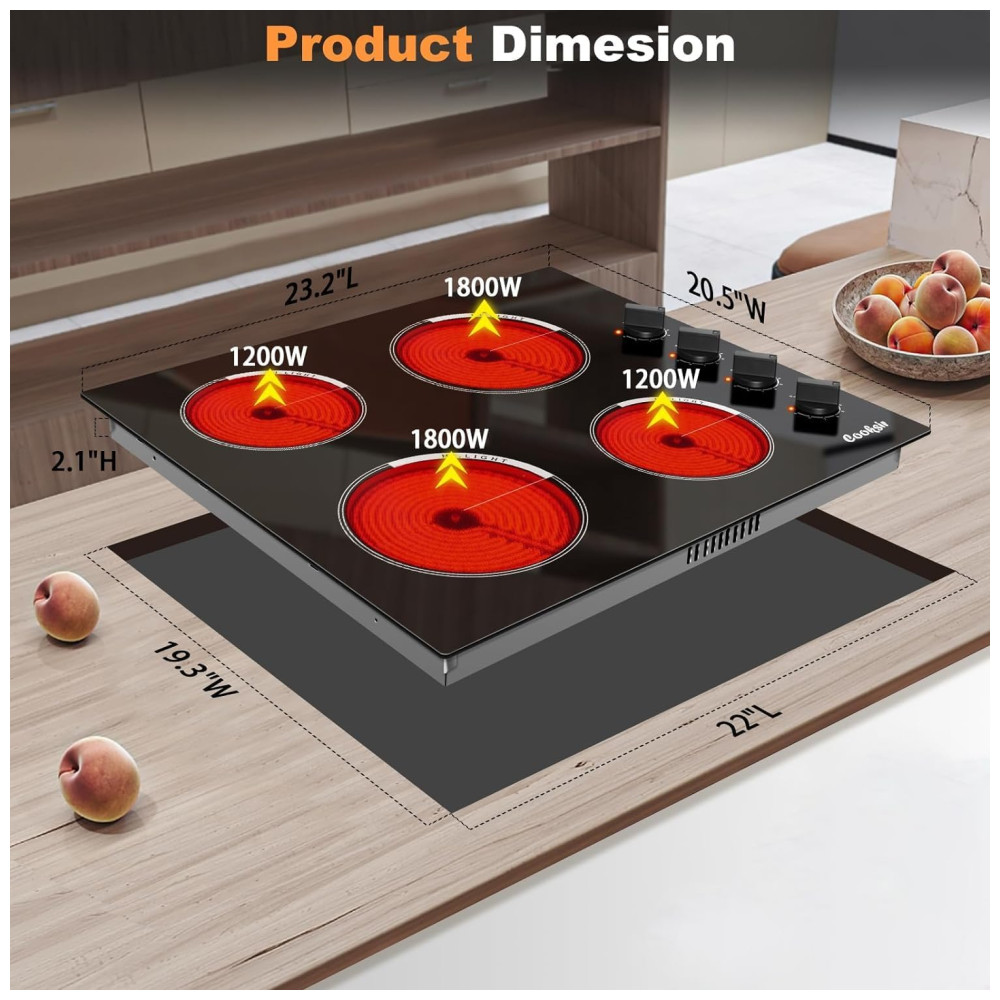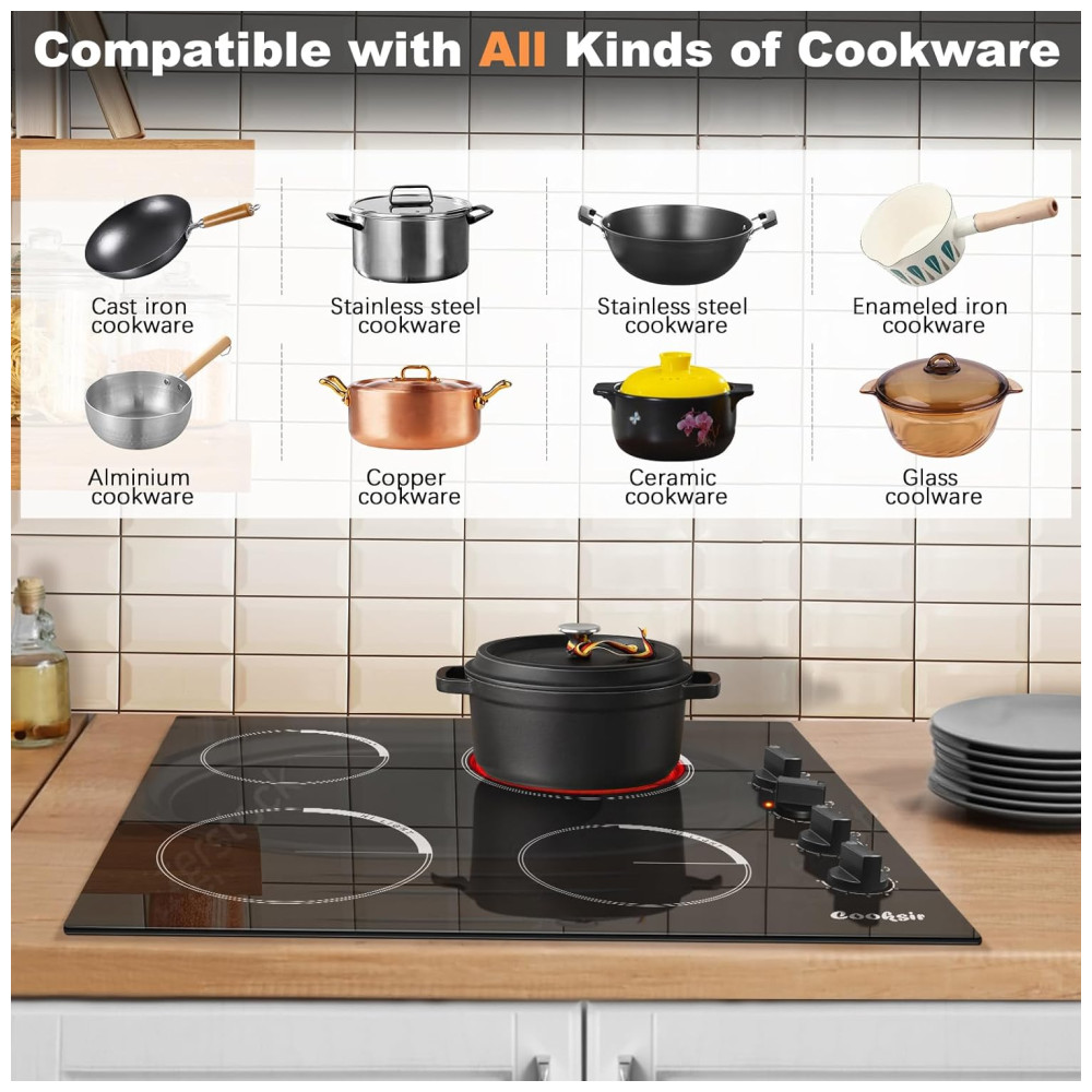 Adequado para todos os tipos de fogões A parte superior do fogão elétrico Cooksir pode ser usada com qualquer tipo de utensílios de cozinha em sua casa, como panelas de alumínio, panelas de cobre, frigideiras de ferro fundido e panelas de aço inoxidável não magnético. O fogão de cerâmica de 4 bocas pode aquecer utensílios de cozinha com eficiência com perda de calor mínima. Simplesmente limpe com um pano limpo quando estiver fresco.