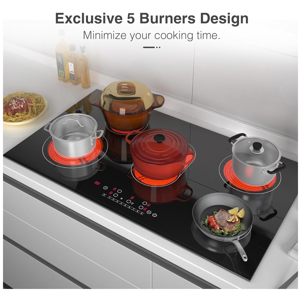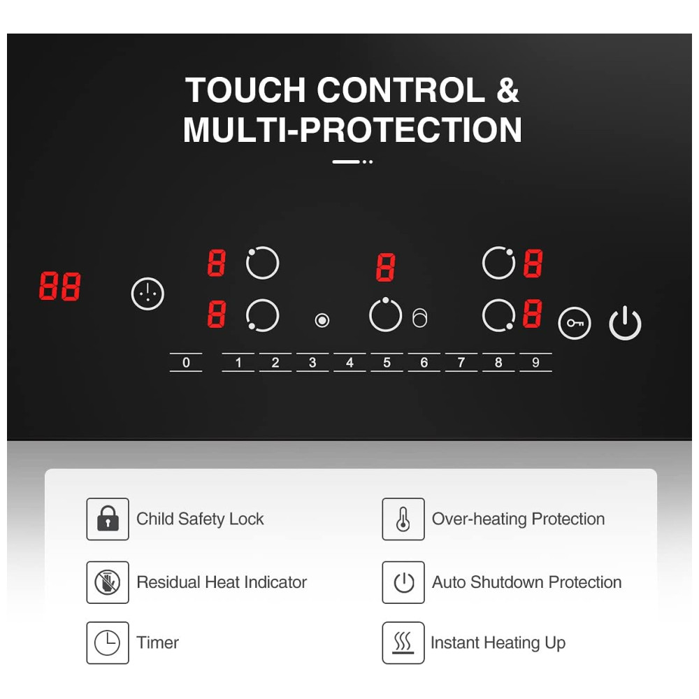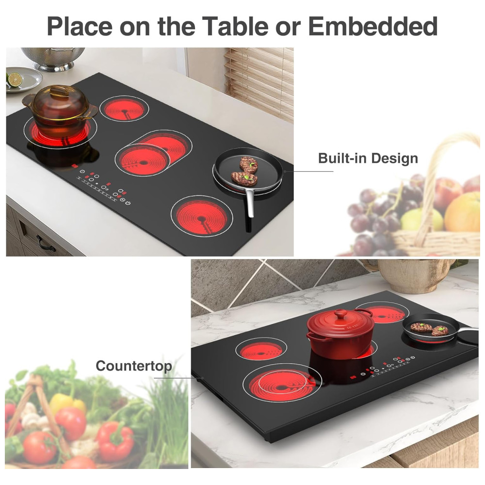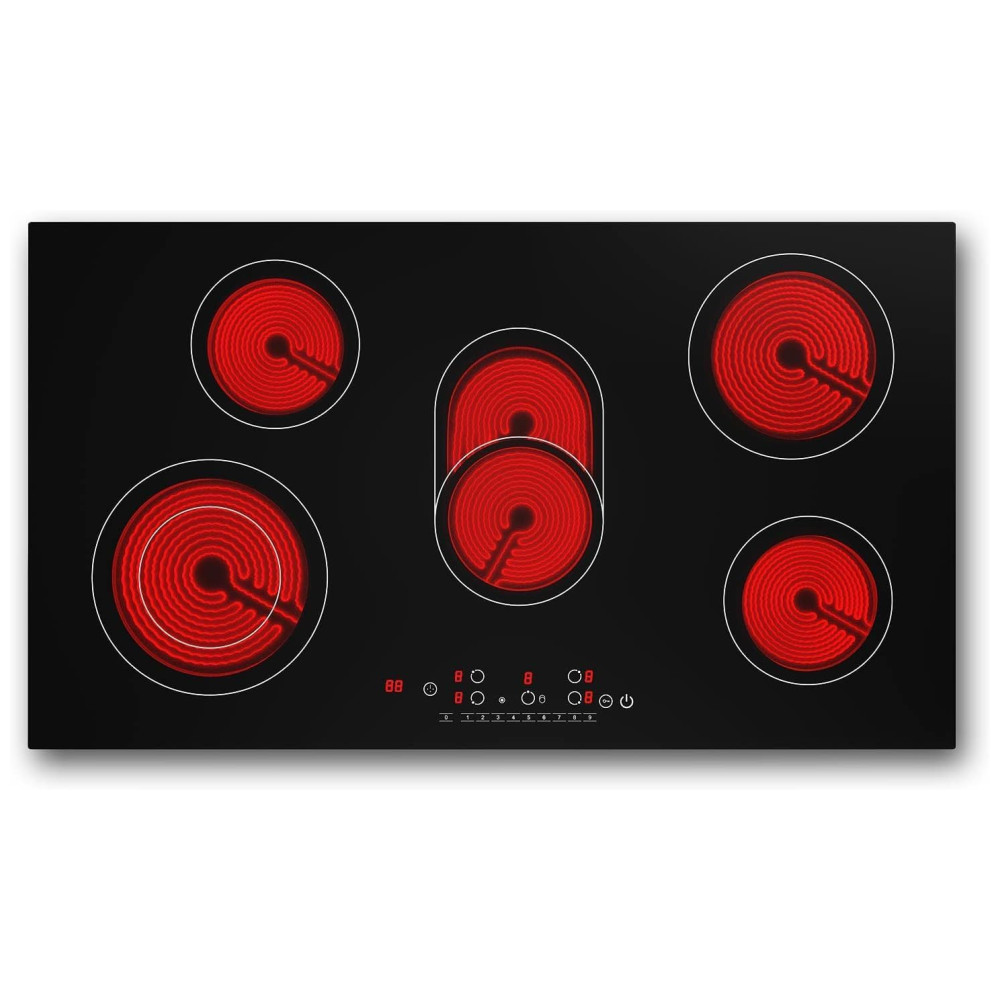 Cooktop elétrico com 9 níveis de ajuste O cooktop elétrico de 36 polegadas 91 centímetros, equipado com 9 configurações de nível de calor, permite variar de derretimento a fervura rápida, mudanças de temperatura precisas e fáceis com o toque de um botão, ferver, ensopado, fritar, fritar , mude de um modo para outro conforme necessário. O efeito de aquecimento do cooktop elétrico de cerâmica é o mesmo do fogão a gás, e a comida feita é tão deliciosa quanto a do fogão a gás.