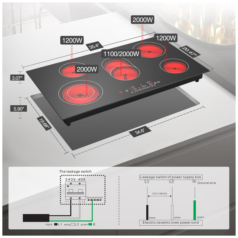 Cooktop elétrico 220V 240v Cooktop elétrico de 5 queimadores 2 × 1200 W e 2 × 2000 W e 2000 W, 240 V , 60 Hz. A tela sensível ao toque LED de 5 queimadores. Pode aquecer rapidamente e ajudar a preparar diferentes alimentos deliciosos ao mesmo tempo. Economize tempo e energia. Seja uma reunião de fim de semana ou uma visita de amigos, você pode facilmente terminar uma grande refeição para entretê los. DICAS O cooktop é sem tomada. Cooktop embutido precisa ser conectado a um fio rígido 220 240v.