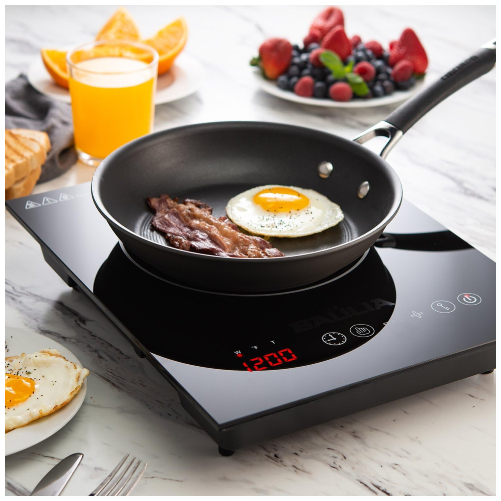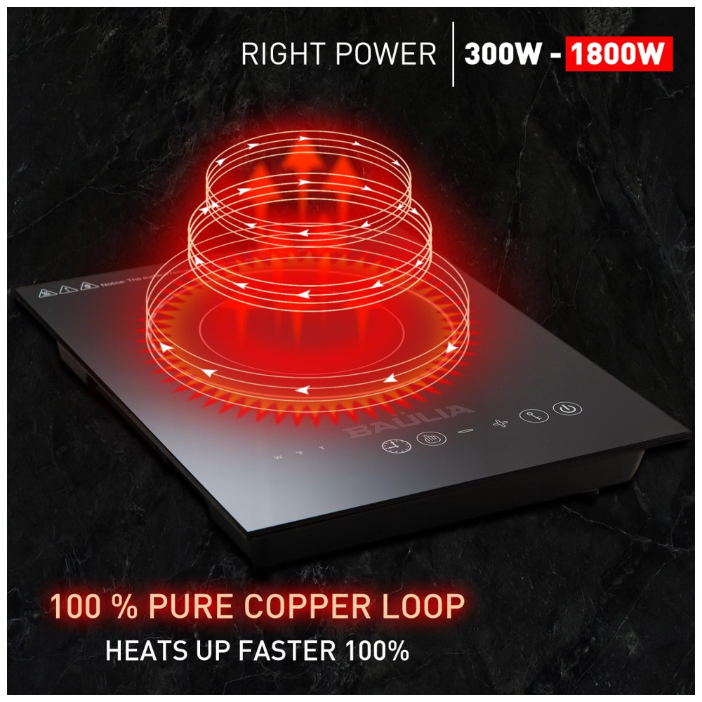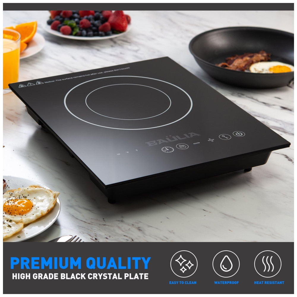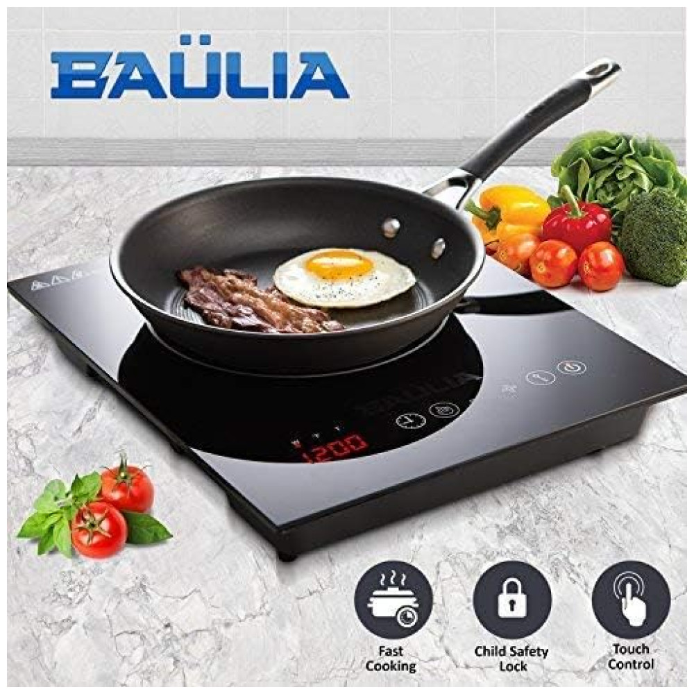 Queimador de Indução de Economia de Energia: O cooktop de indução Baulia consome muito menos eletricidade do que outros queimadores de fogão e aquece alimentos ou líquidos muito mais rápido do que fogões a gás, elétricos ou infravermelhos.
