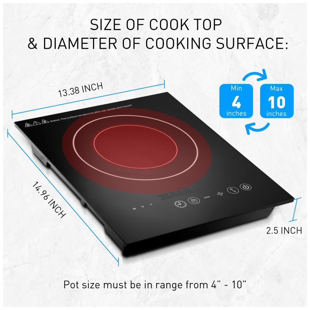 Fácil de Limpar: A superfície lisa de vidro do queimador de indução de bancada é fácil de limpar. O cooktop aquece apenas a panela, então qualquer derramamento na superfície não queimará nem grudará.