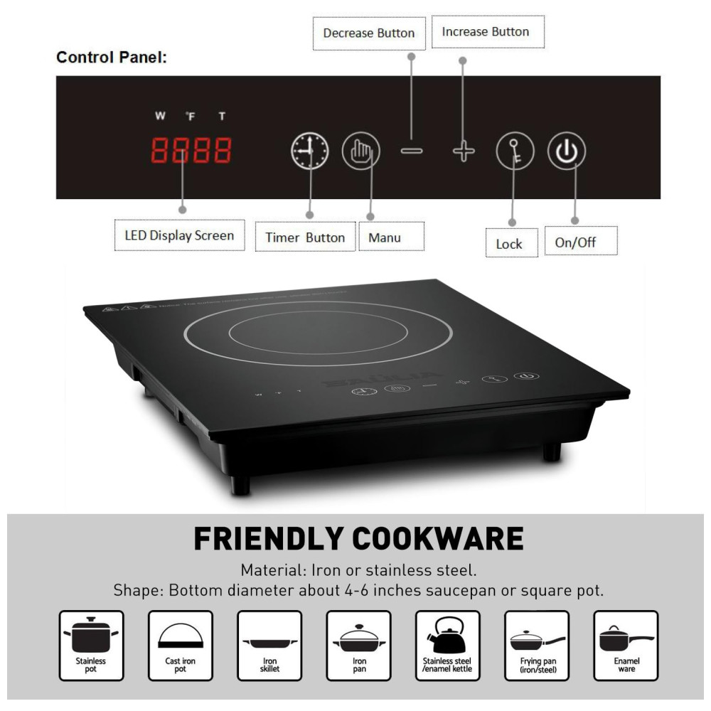 Compatível com Utensílios Magnéticos: Este cooktop de indução portátil é compatível com alumínio fundido, ferro e aço esmaltados, aço inoxidável com fundo magnético ou ferro fundido. Se um ímã grudar no fundo do utensílio de cozinha, ele é compatível com indução.