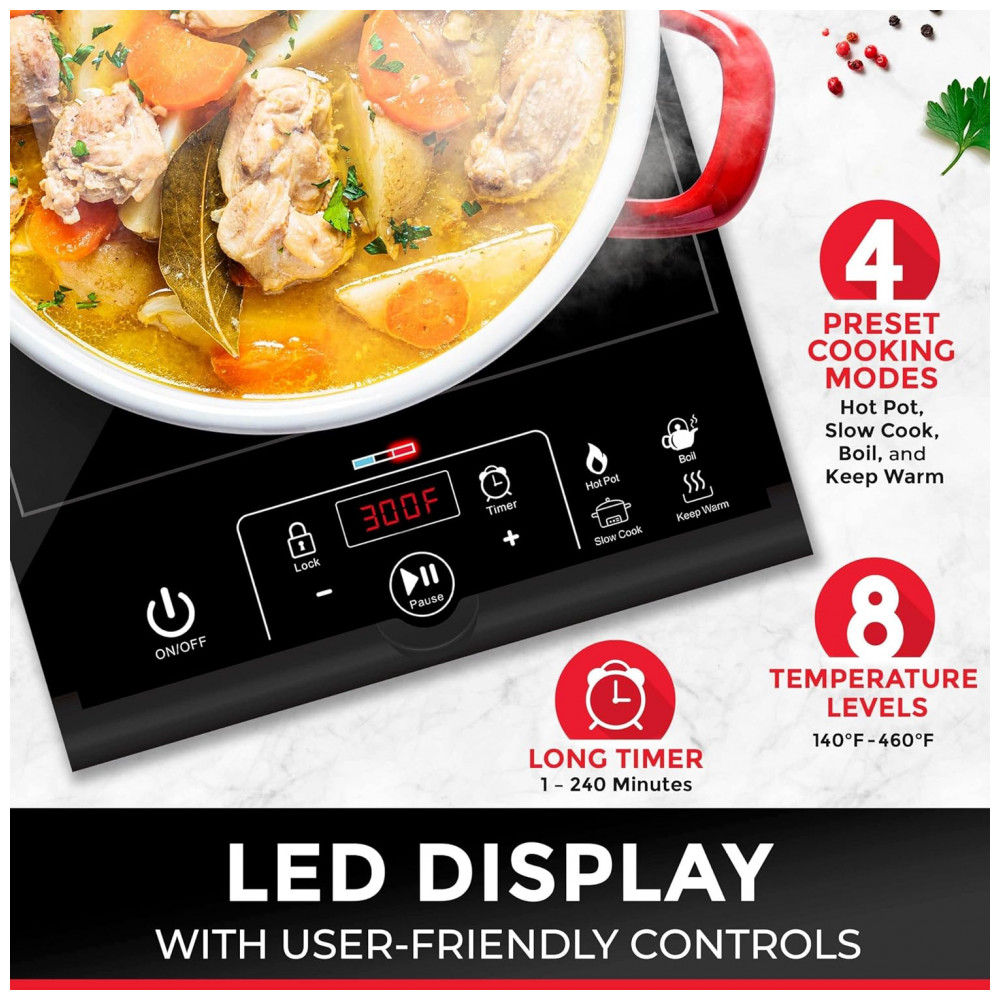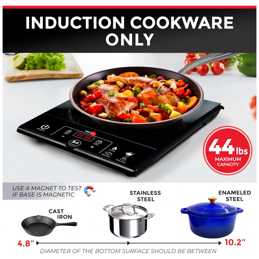 O altamente versátil cooktop de indução RapidTherm oferece 1800W de potência de cozimento e muitas funcionalidades inteligentes ao seu alcance. Aprovado pela ETL e operando em 120V padrão, o cooktop elétrico leve é fácil de manusear e armazenar, sendo ideal para trailers, pequenos apartamentos ou qualquer lugar onde você precise de um cooktop extra. Sem bobinas quentes ou chamas abertas, é a maneira descomplicada de criar pratos deliciosos.