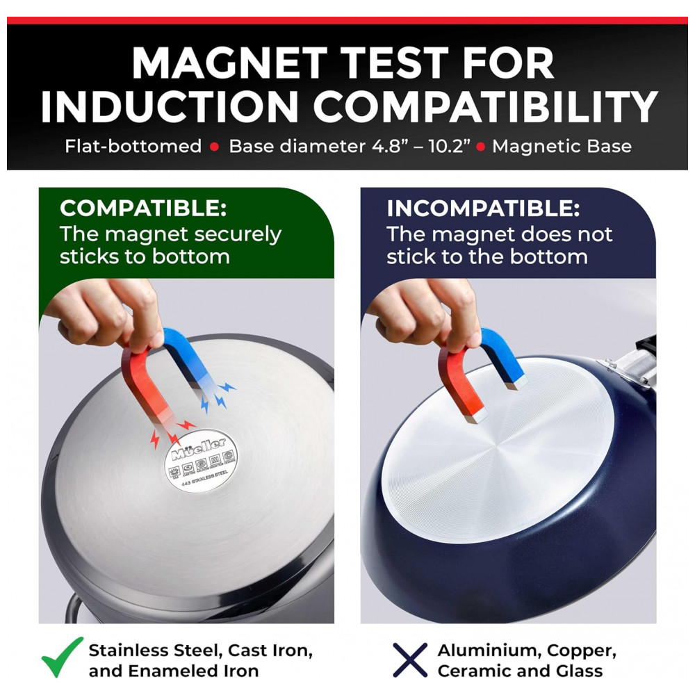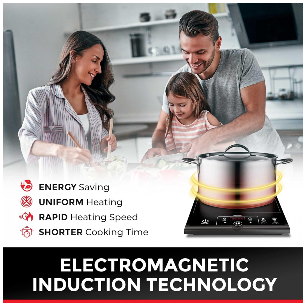 O potente queimador de indução aquece apenas o diâmetro da panela, evitando desperdício de energia. Além disso, o aquecimento é instantâneo e distribuído uniformemente, cozinhando seus alimentos 50% mais rápido que os cooktops a gás ou elétricos convencionais. Adequado para panelas compatíveis com indução, com bases ferrosas planas (teste com um ímã), como ferro fundido, aço esmaltado ou aço inoxidável magnético, com diâmetro de base entre 12 cm e 26 cm.