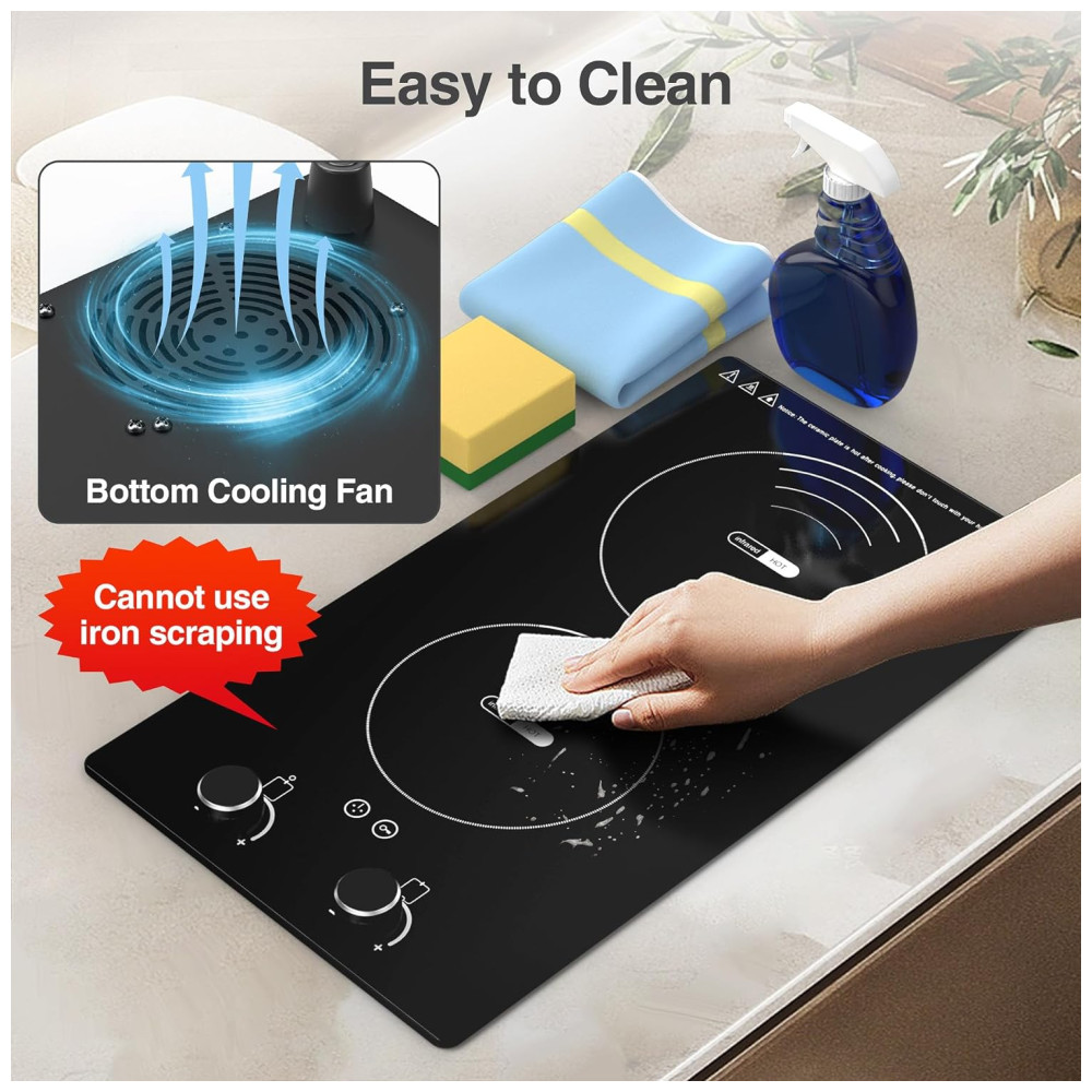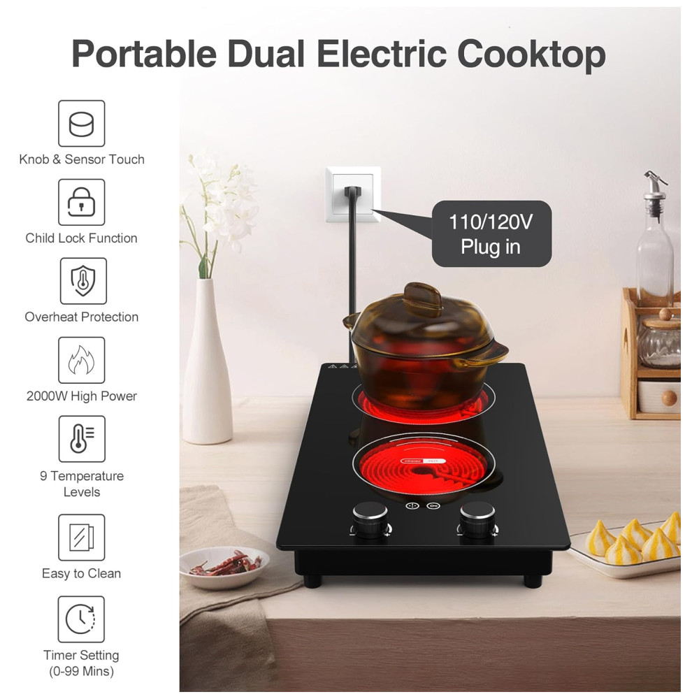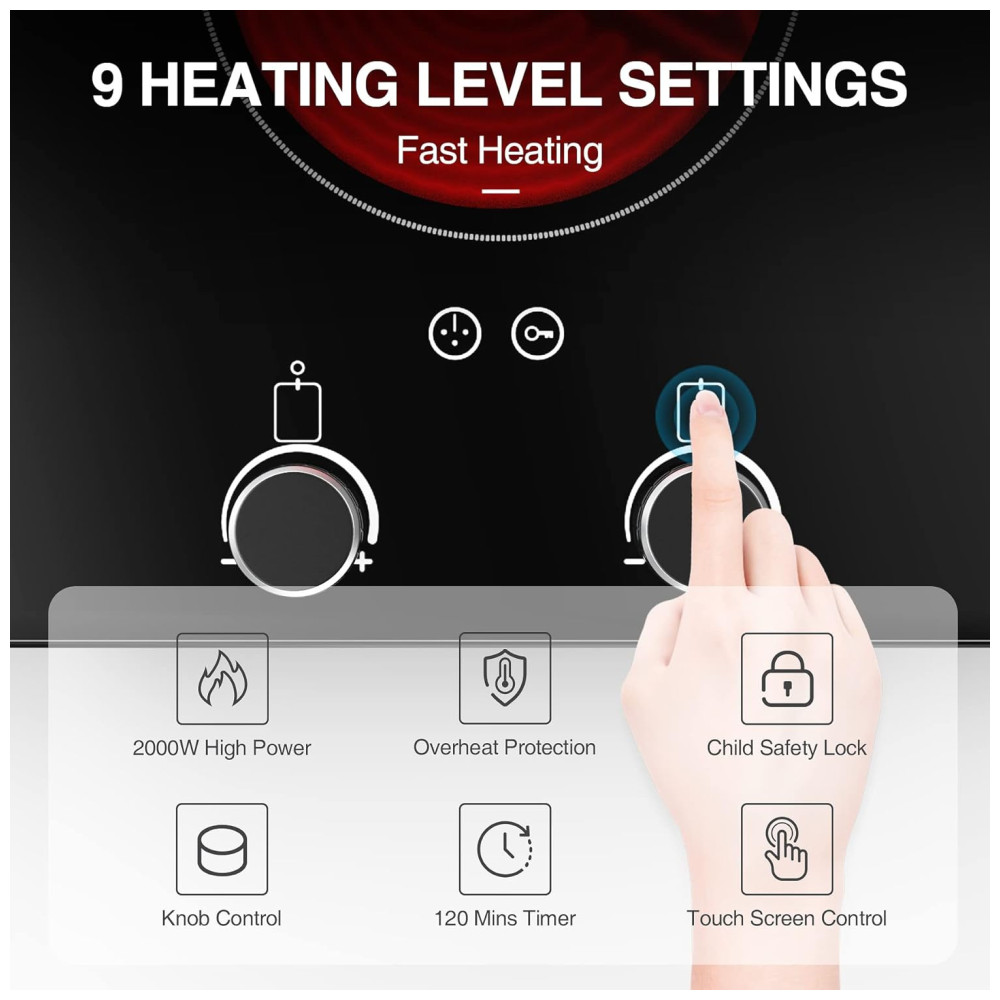 Cooktop Elétrico de Indução Portátil com Queimador Duplo 9 Níveis de Potência Trava para Crianças Temporizador Indicador de Superfície Quente e Proteção Contra Superaquecimento 110V 2000W K2003 Preto