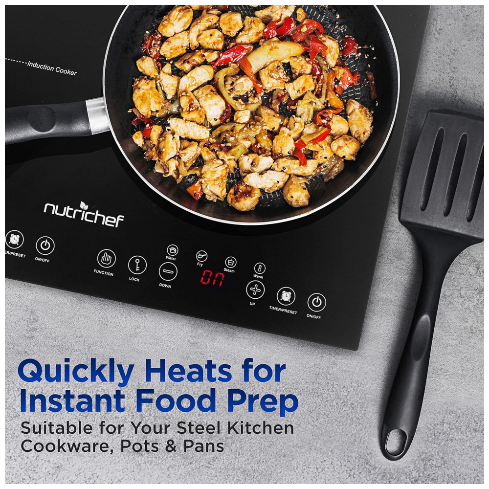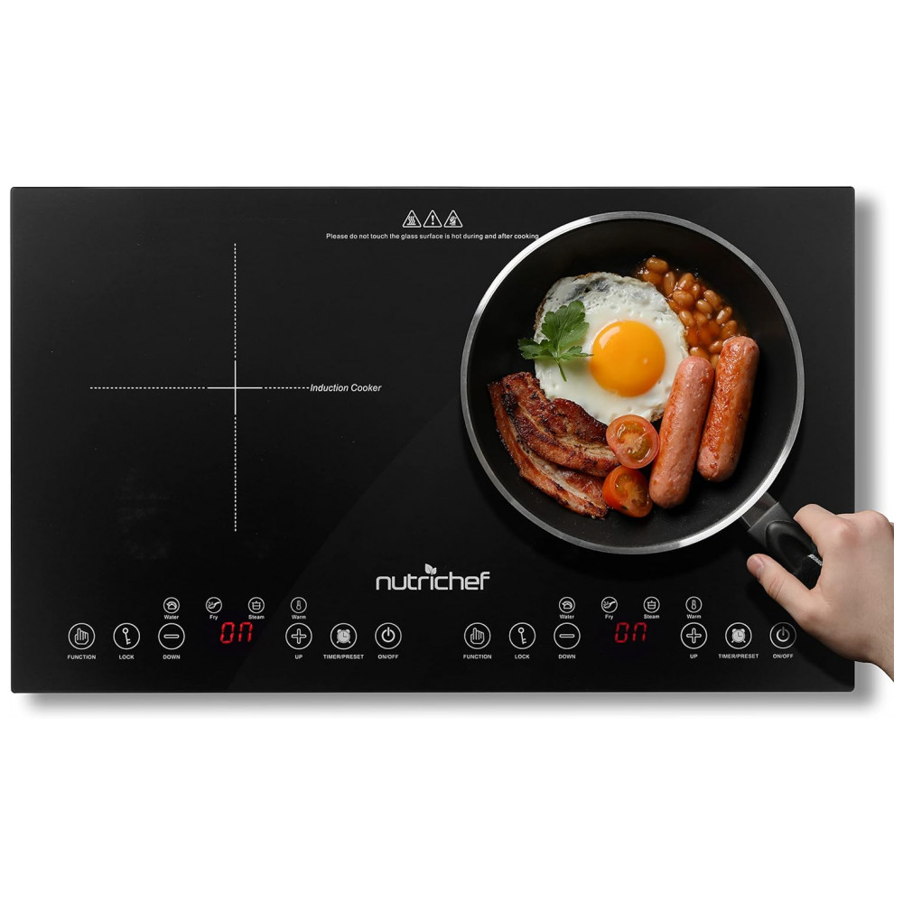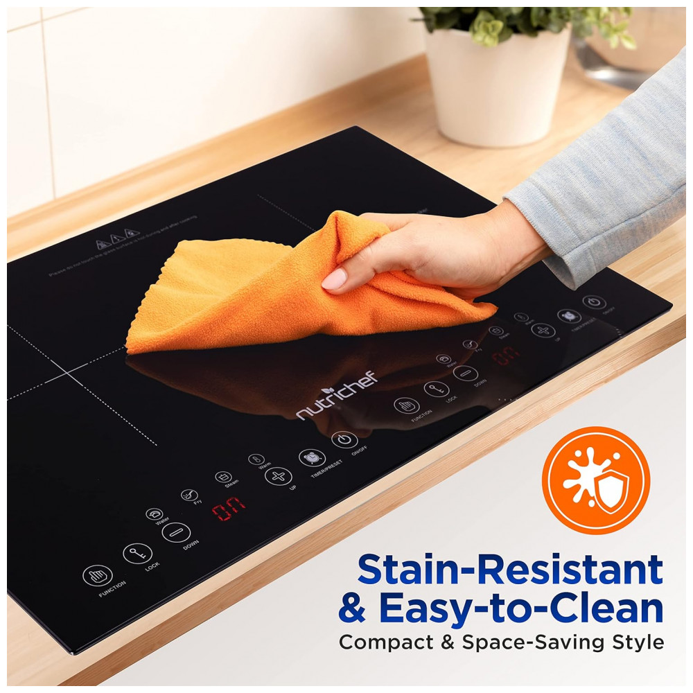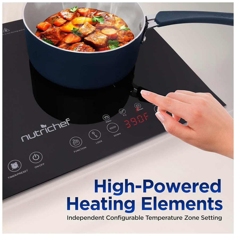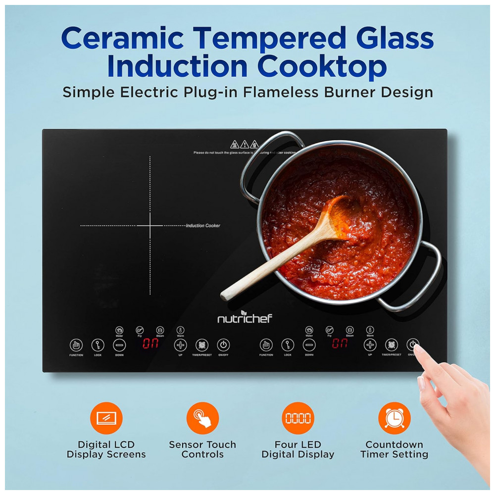 Transforme sua cozinha com o Cooktop de Indução Duplo NutriChef, combinando tecnologia avançada, segurança e eficiência em um design portátil e elegante.
