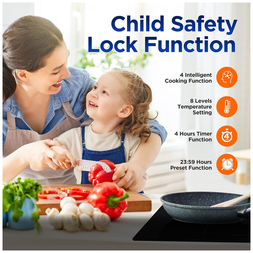 FUNÇÃO DE TRAVA: Equipado com uma trava de segurança infantil que bloqueia todos os botões operacionais do cooktop, protegendo os pequenos de possíveis queimaduras.