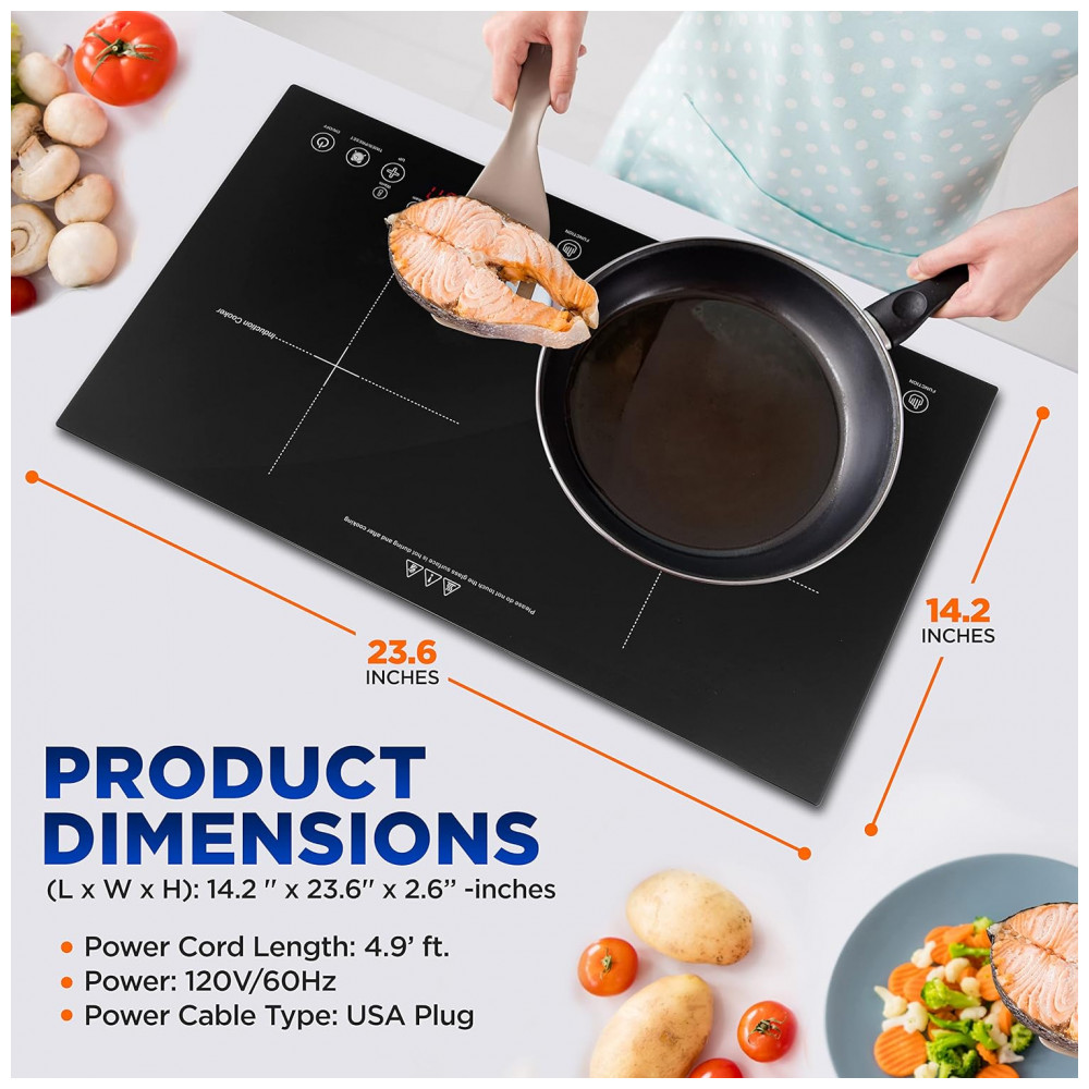 DUAS ZONAS DE AQUECIMENTO: Este cooktop de indução digital profissional para bancada está equipado com 2 zonas de aquecimento circulares com configurações de temperatura independentes e uma tela LCD digital.