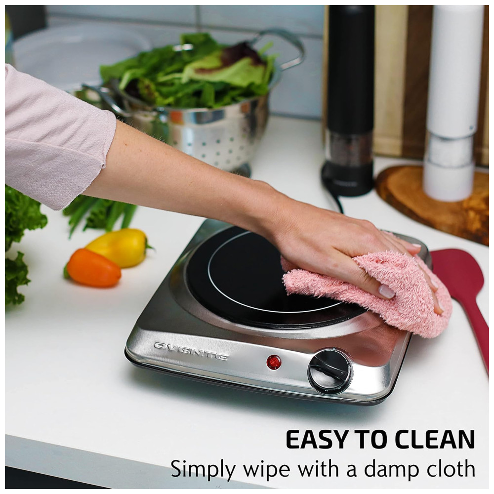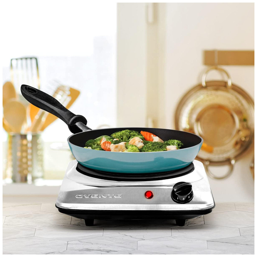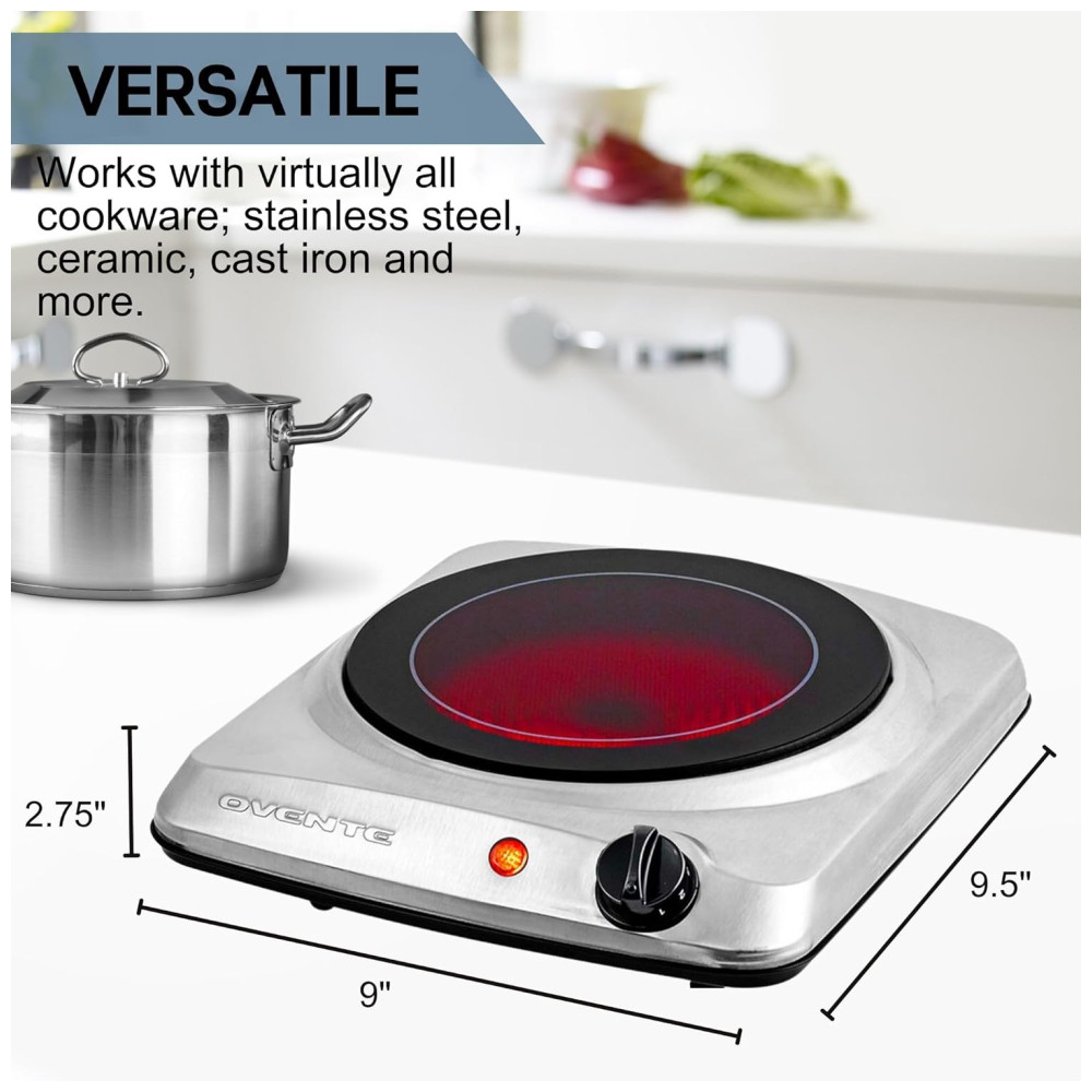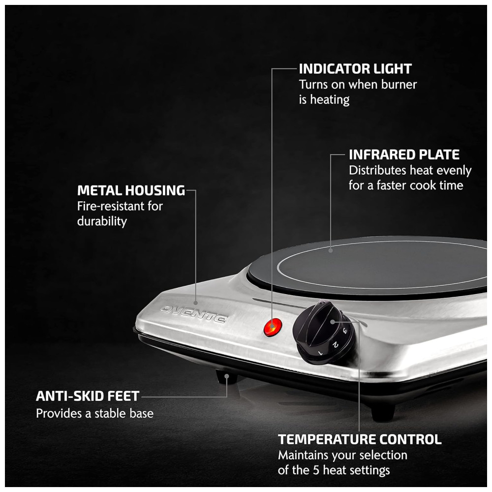 Prepare refeições quentes e frescas em qualquer lugar com o queimador de placa única infravermelho OVENTE. Esta alternativa prática ao fogão tradicional oferece um desempenho excepcional sem limitações de utensílios de cozinha. Com um botão de controle de termostato, você pode aquecer alimentos e obter um cozimento uniforme, mantendo a temperatura constante conforme desejado.