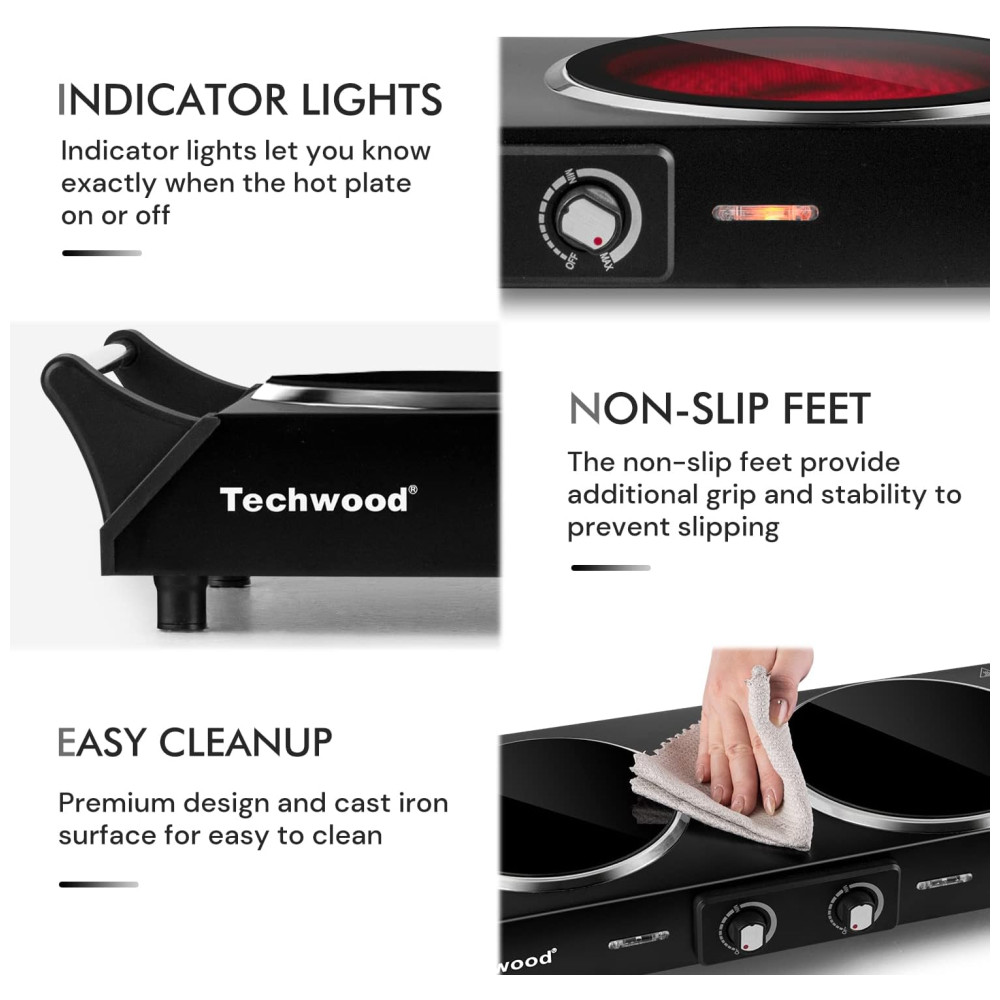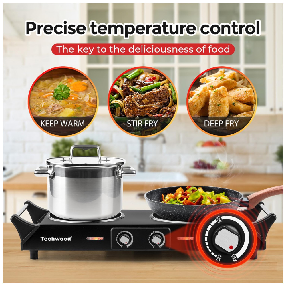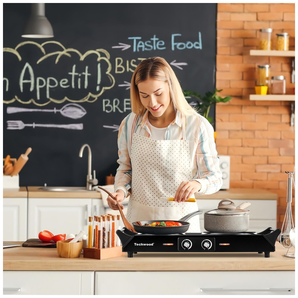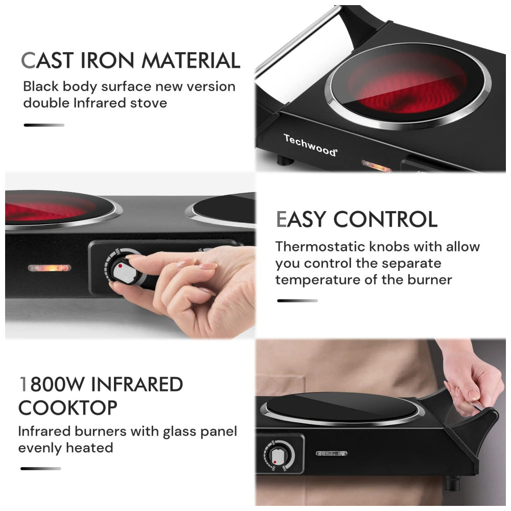 Cooktop Elétrico de Infravermelho Portátil em Aço Inoxidável Escovado com Queimador Duplo e Controle de Temperatura Duplo Ajustável 110V 1800W Techwood Preto