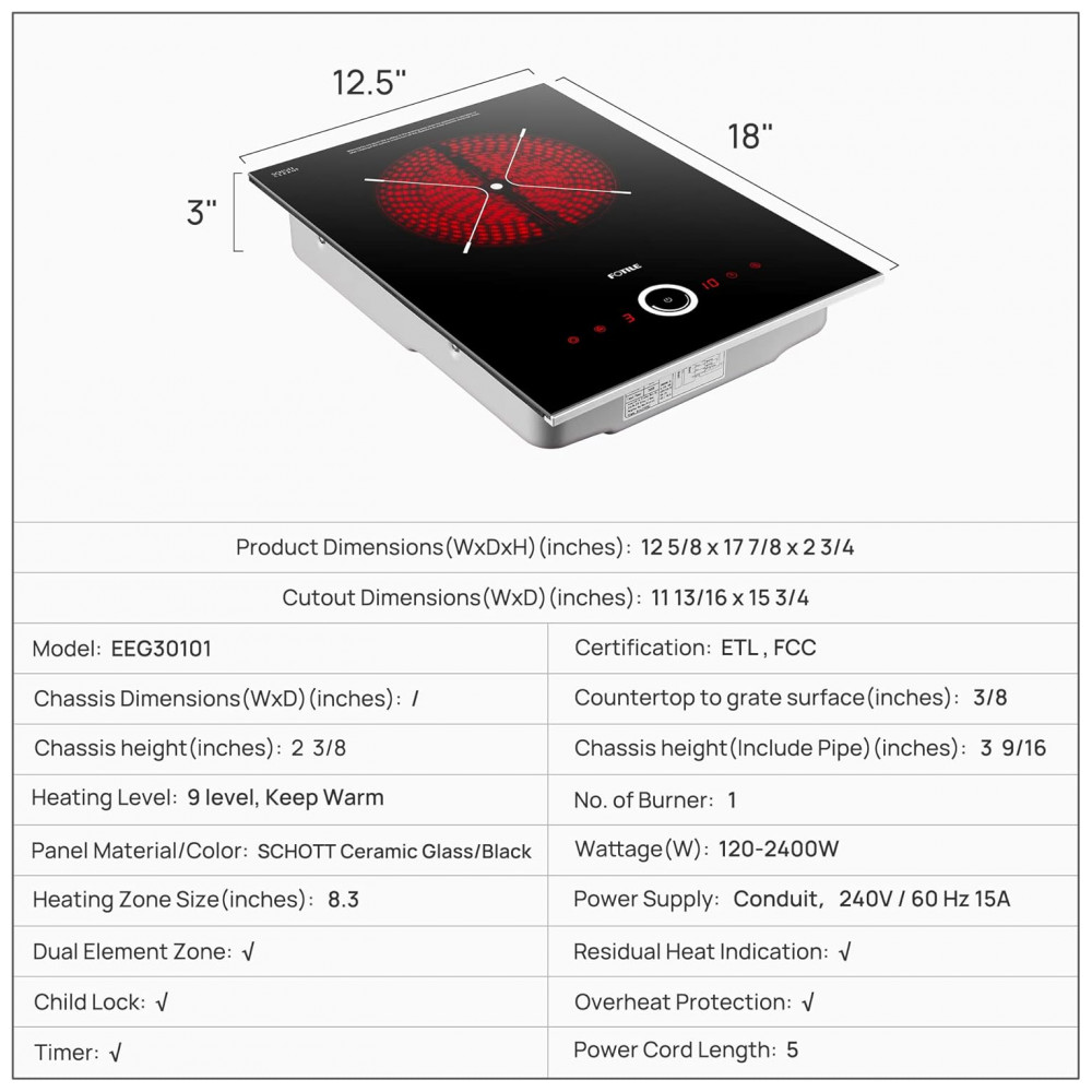 Conteúdo da embalagem: Cooktop elétrico 1 queimador cabo de alimentação integrado kit de instalação manual do usuário em inglês