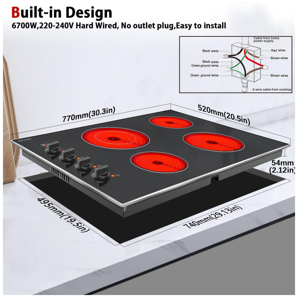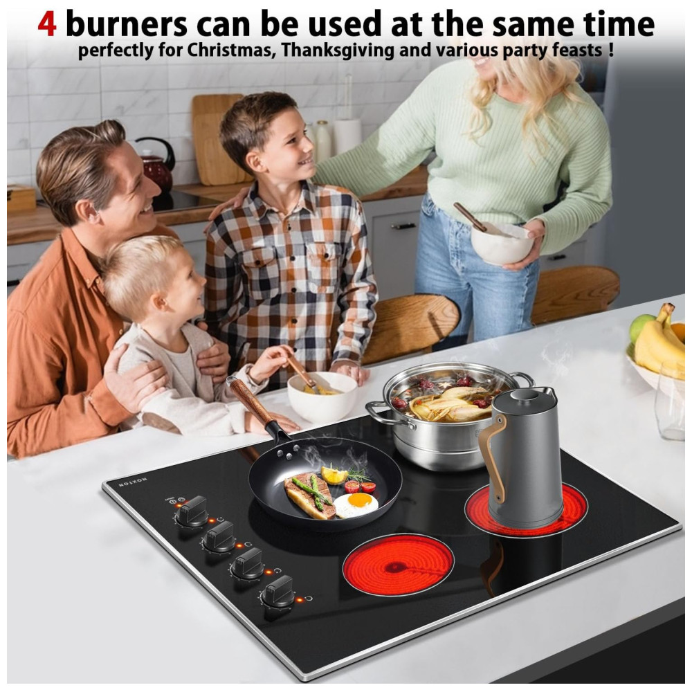 O Cooktop Elétrico da Noxton possui um design embutido com estrutura metálica de proteção de vidro, proporcionando um encaixe mais uniforme na bancada. Sua superfície de vidro de alta qualidade confere um visual elegante à sua cozinha. Diferentemente de outros cooktops elétricos de vidro, o nosso cooktop possui uma moldura metálica que protege melhor a superfície de vidro de danos, tornando-o mais seguro e durável. Com quatro queimadores e design de botões, este cooktop elétrico de 220V é especialmente adequado para idosos ou pessoas com dificuldades de visão. Com 9 níveis de potência, é capaz de atender a diversas necessidades de cocção. Além disso, conta com funções de segurança como indicador de superfície quente, proteção contra superaquecimento e desligamento automático. Adequado para todo tipo de utensílios de cozinha, o Cooktop Noxton de 4 queimadores aquece de forma rápida e uniforme, tornando-se um ótimo aliado na sua cozinha.