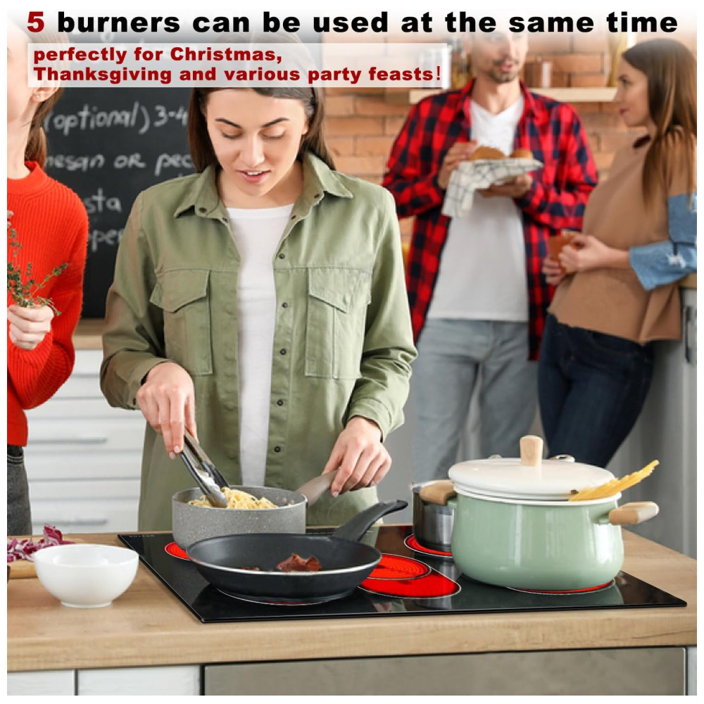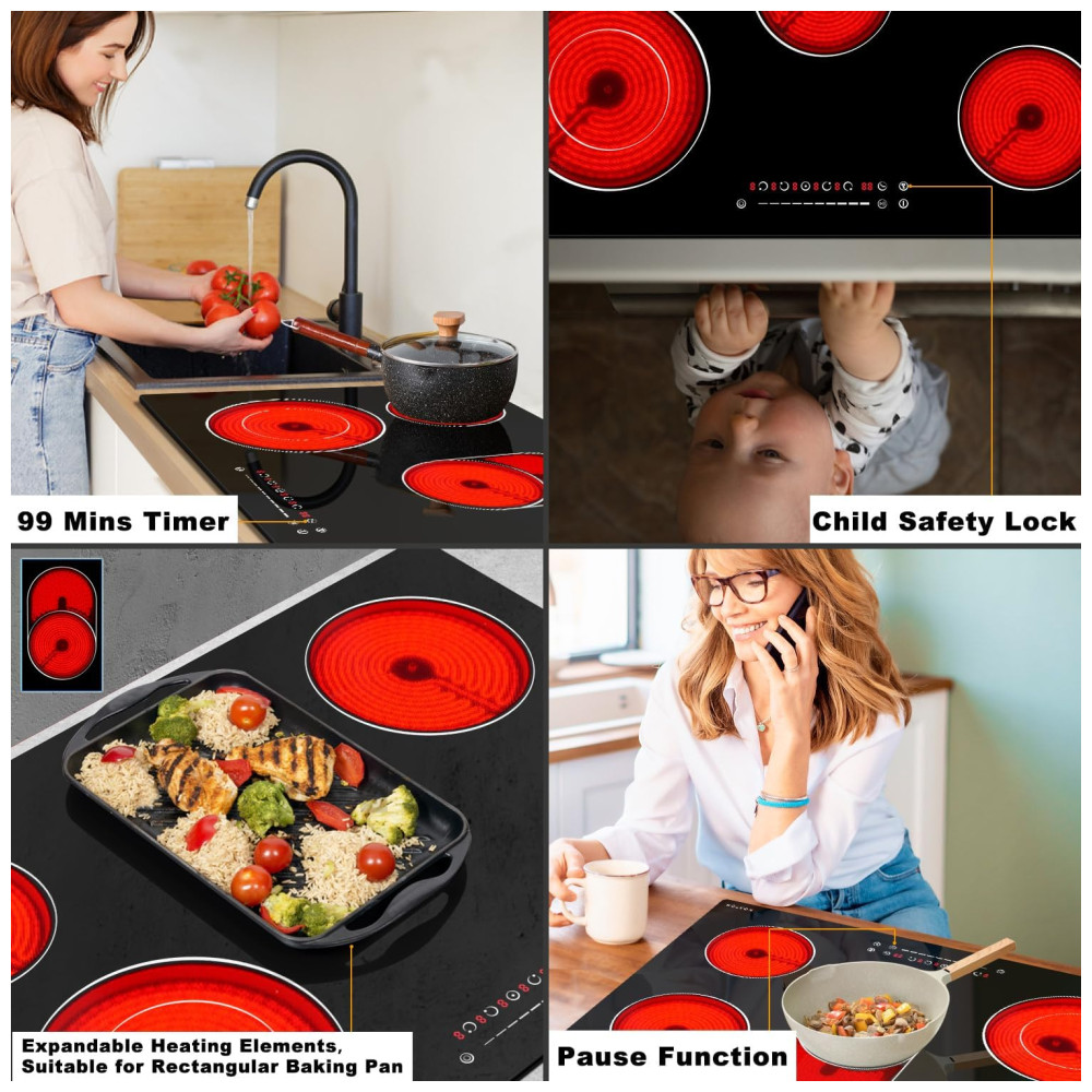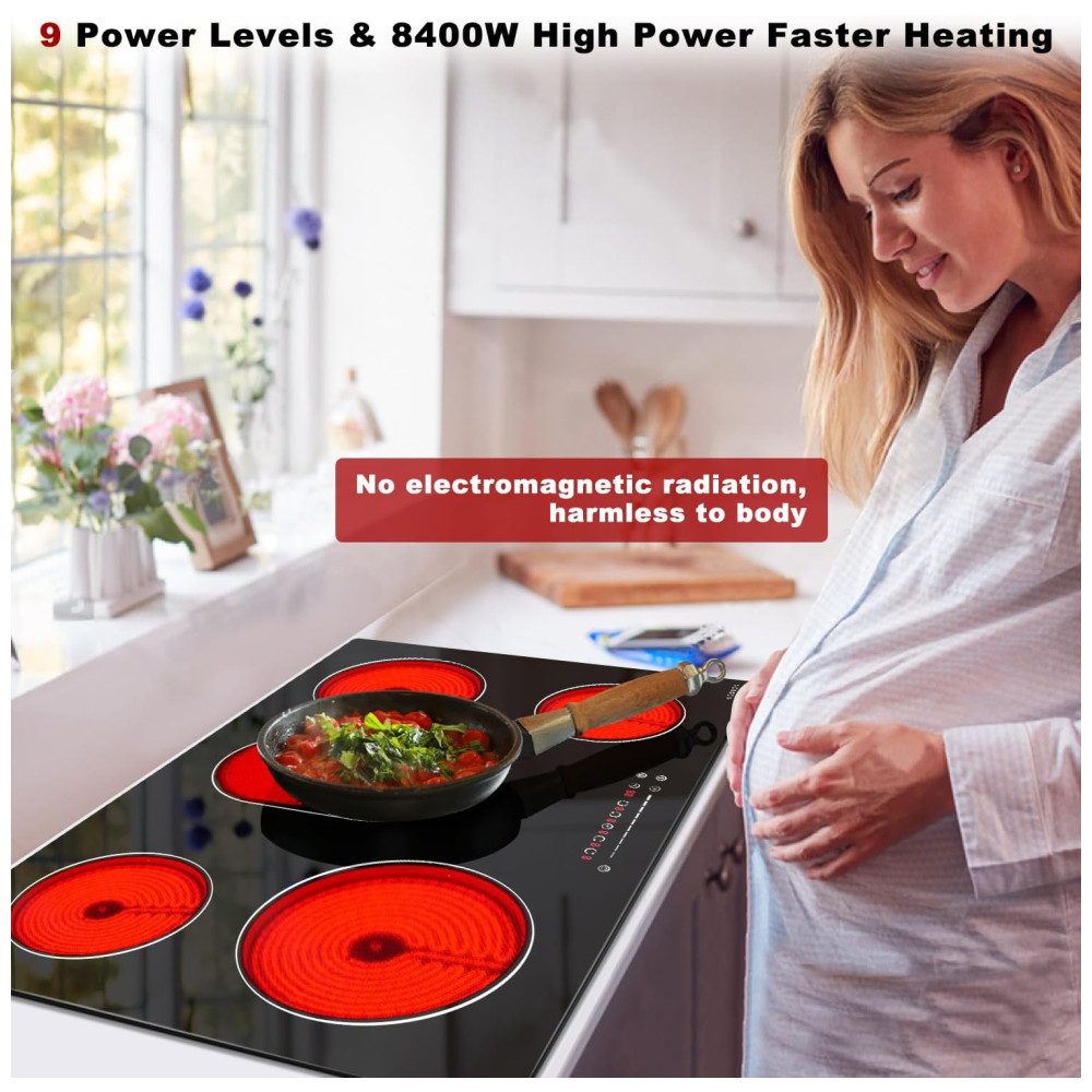 O Cooktop elétrico Noxton de 8400W oferece alta potência para um aquecimento rápido, permitindo cozinhar em menos tempo. Com 5 queimadores, você pode utilizar panelas de ferro, aço inoxidável, vidro, cerâmica e cobre. O controle deslizante especial possibilita ajustar facilmente os níveis de potência e tempo de cozimento. Além disso, conta com timer de 99 minutos, trava de segurança infantil, aviso de alta temperatura, proteção contra superaquecimento, entre outras funções. Fácil de limpar, possui design elegante com vidro liso preto.