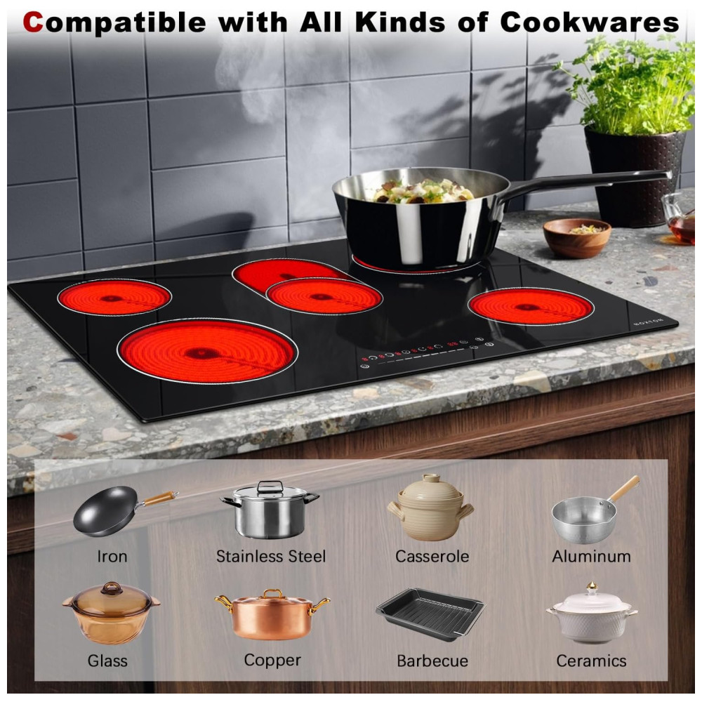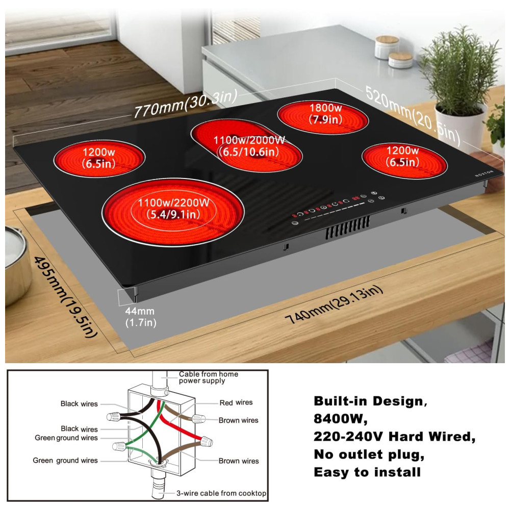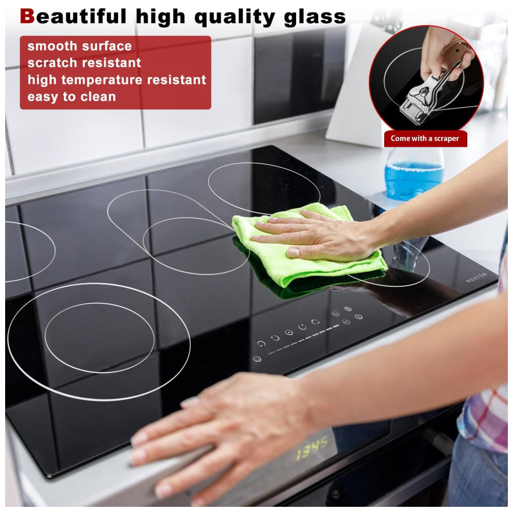 Cooktop Elétrico Noxton 76 cm 8400W 5 Bocas Embutido Fogão Elétrico Radiante Vidro Temperado Controle Touch e Moldura Metálica