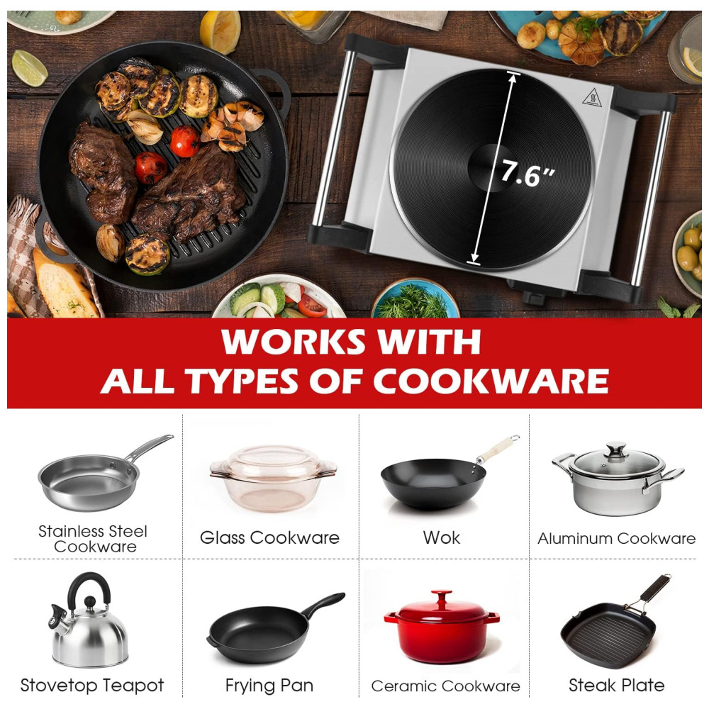 Compatível com diversos tipos de utensílios de cozinha, incluindo panelas de alumínio, cobre, ferro fundido e aço inoxidável não magnético, ele oferece aquecimento eficiente com perda mínima de calor. Seu painel cerâmico e corpo em aço inoxidável são duráveis e fáceis de limpar basta passar um pano limpo depois de esfriar.