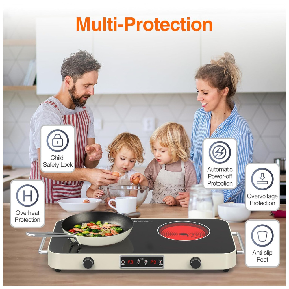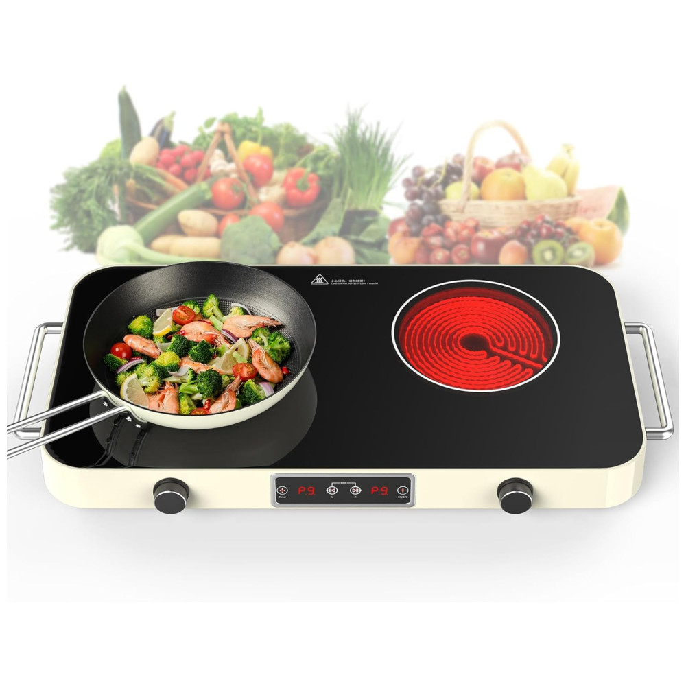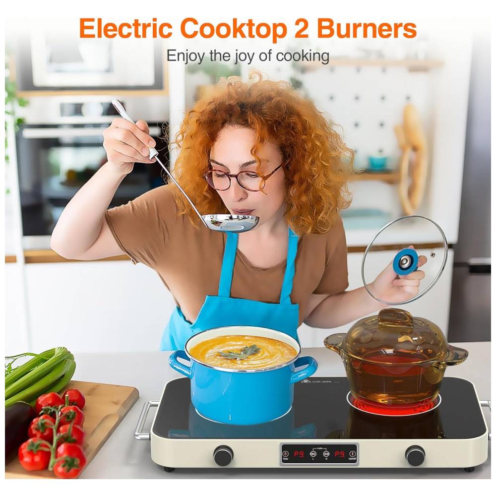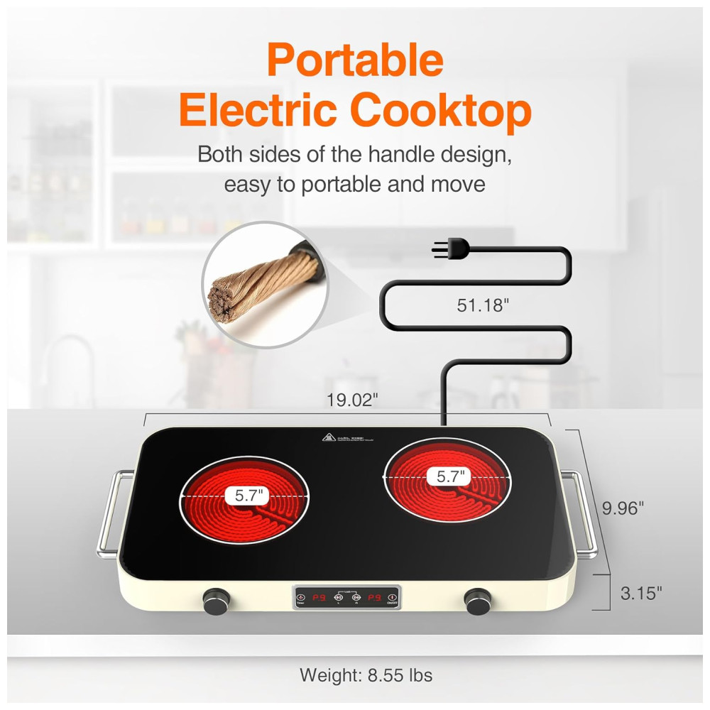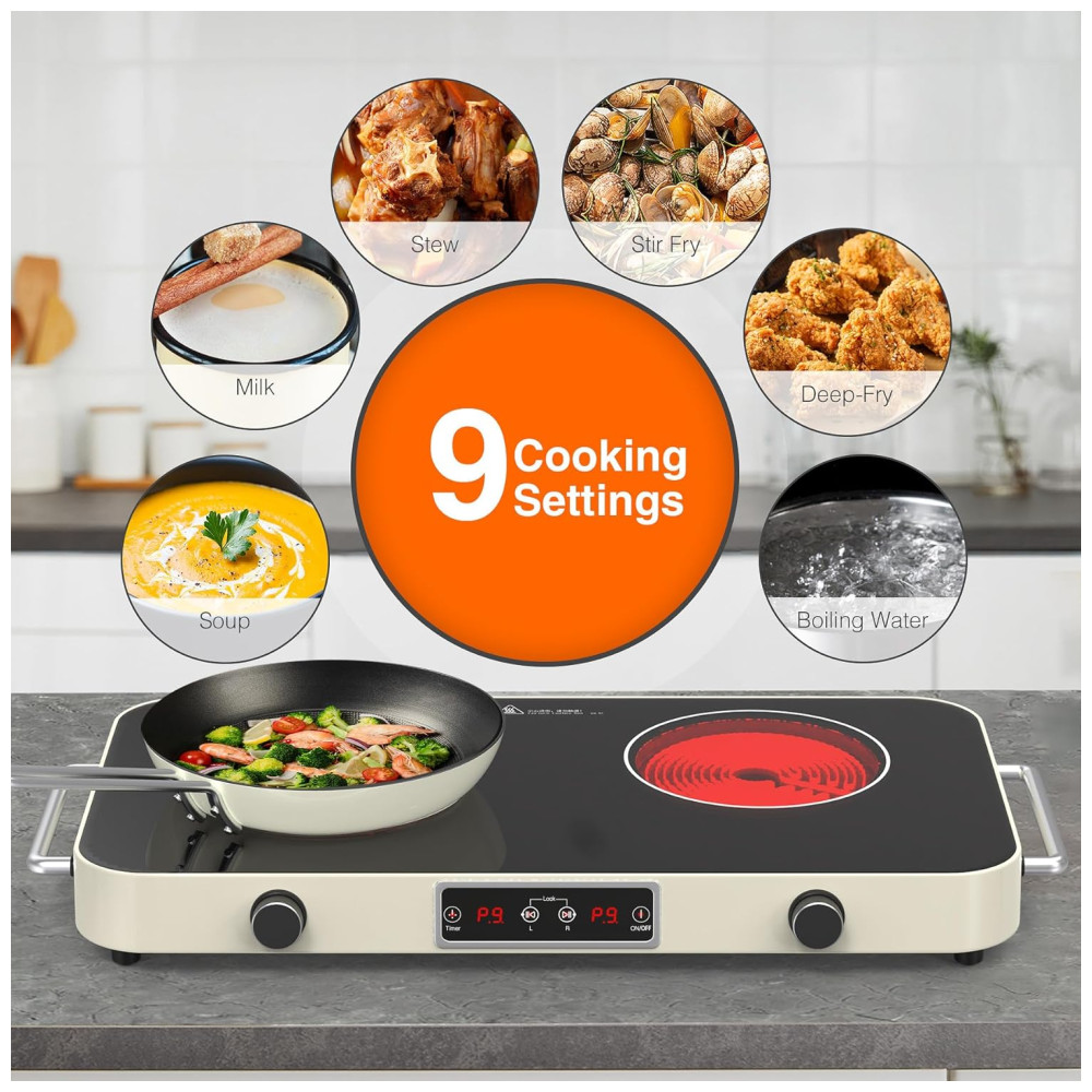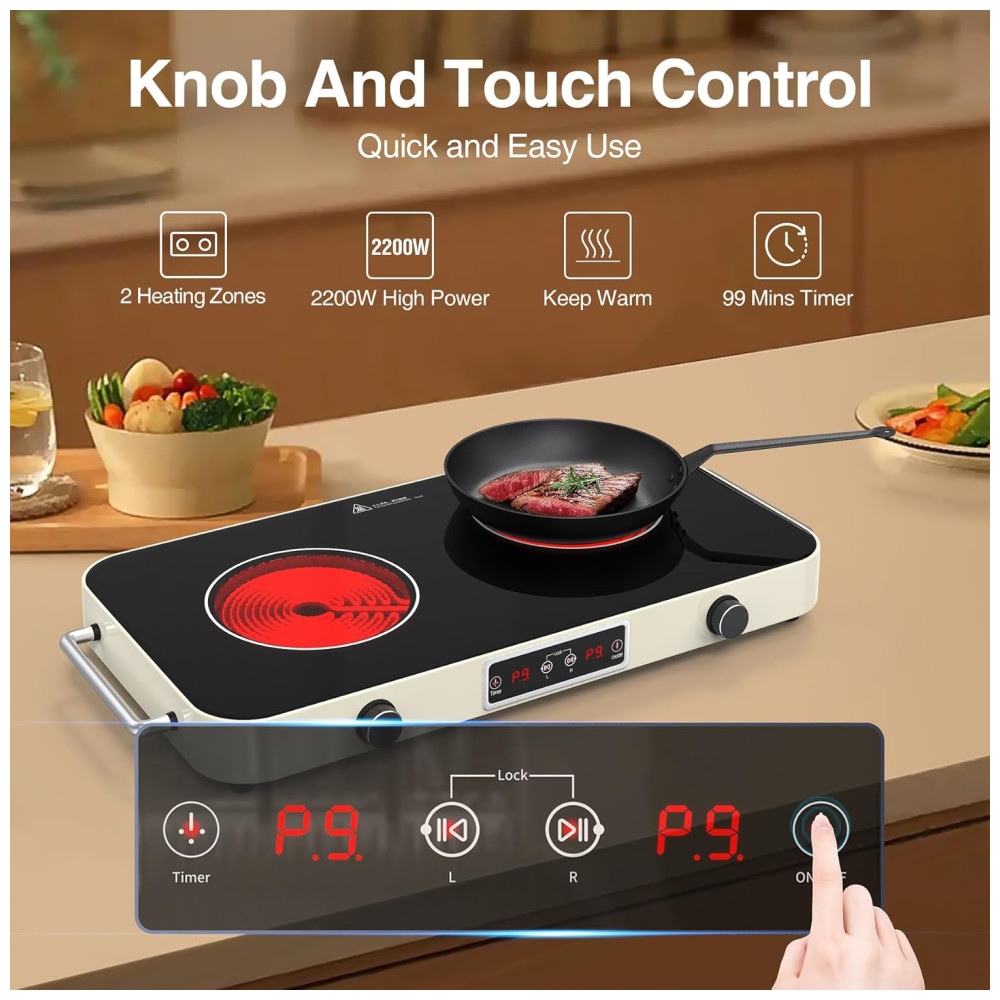 O cooktop elétrico duplo GIHETKUT Knob oferece duas áreas de aquecimento independentes, permitindo preparar diferentes alimentos ao mesmo tempo. Com potência total de 2200W (1100W por queimador) e 9 níveis de potência, você pode ajustar a intensidade para refogar, fritar, ferver, cozinhar no vapor e assar, atendendo a uma variedade de necessidades culinárias.