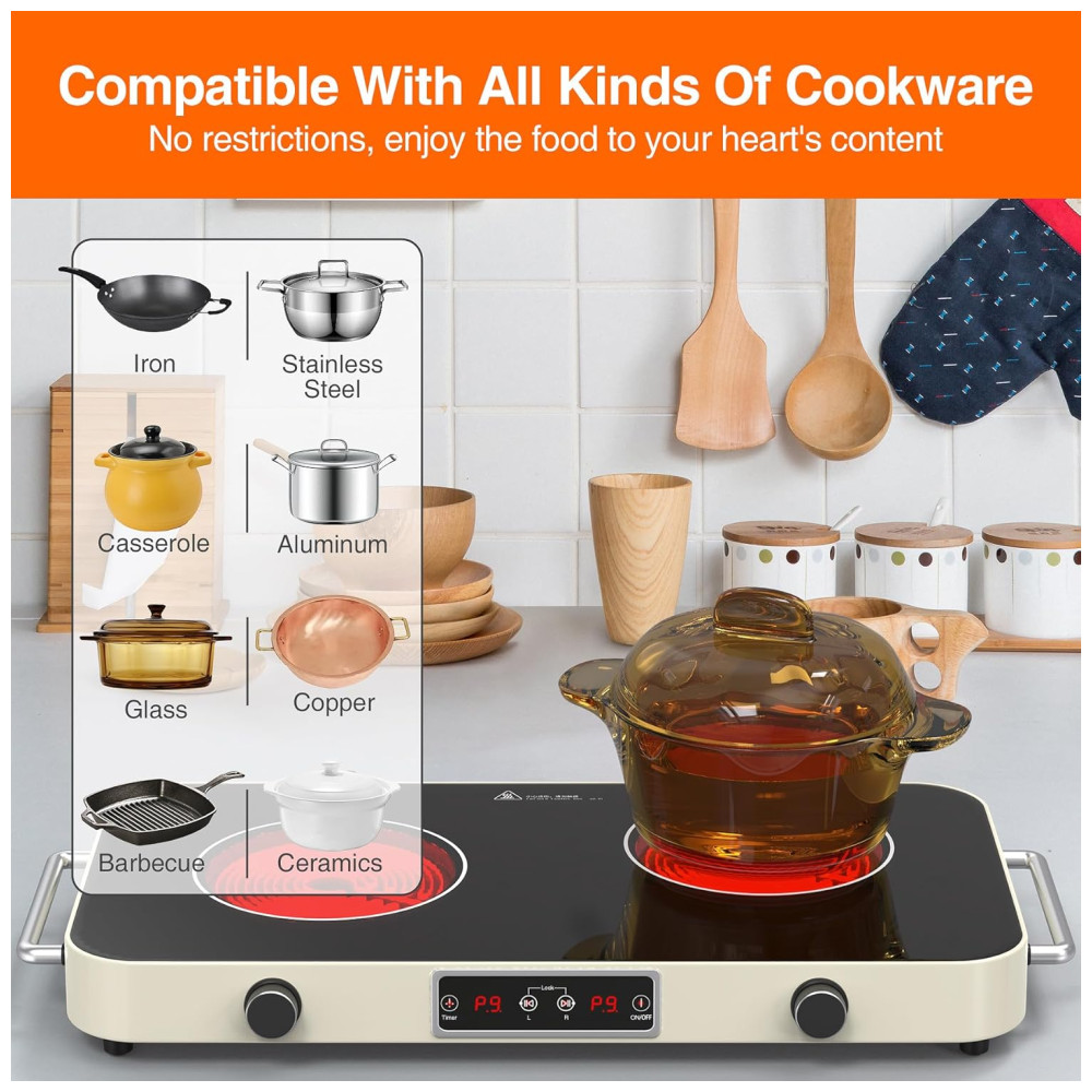 Cooktop Elétrico Portátil de Indução com 2 Bocas 9 Níveis de Potência Temporizador 2 Alças Controle de Botão e Trava de Segurança para Crianças 110V 2200W GIHETKUT Branco
