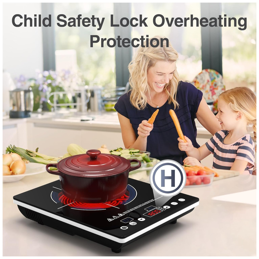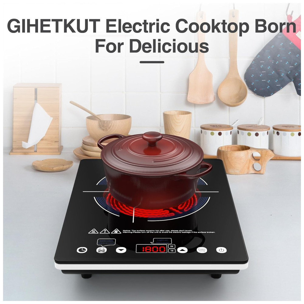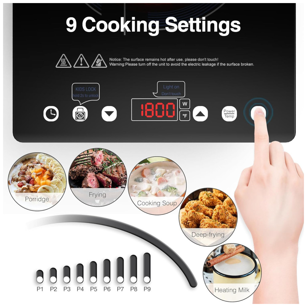 Cooktop Elétrico Portátil de Indução com 9 Níveis de Potência Trava para Crianças Temporizador e Proteção Contra Superaquecimento 110V 1800W GIHETKUT Preto