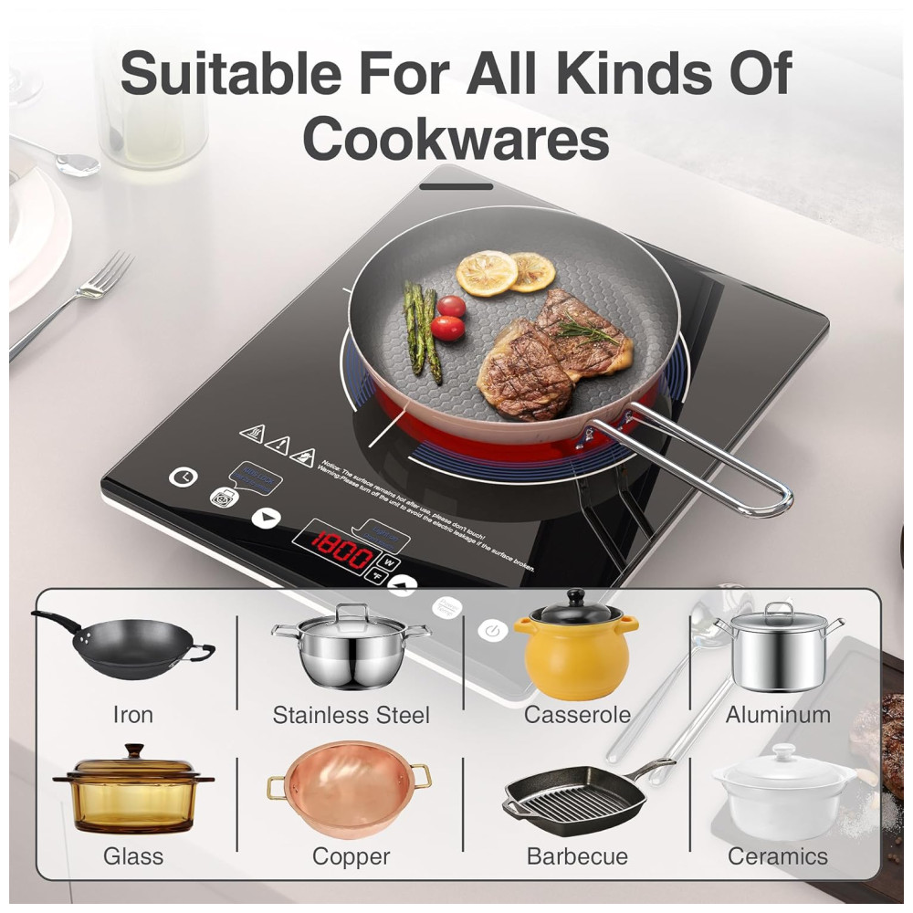 Compatível com uma ampla variedade de utensílios de cozinha, como panelas de alumínio, potes de cobre, jarras de vidro e panelas de aço inoxidável, este fogão é versátil e pode ser usado para cozinhar tudo, desde ferver água e aquecer molhos até preparar sopas, fritar bifes, grelhar queijo e vegetais.