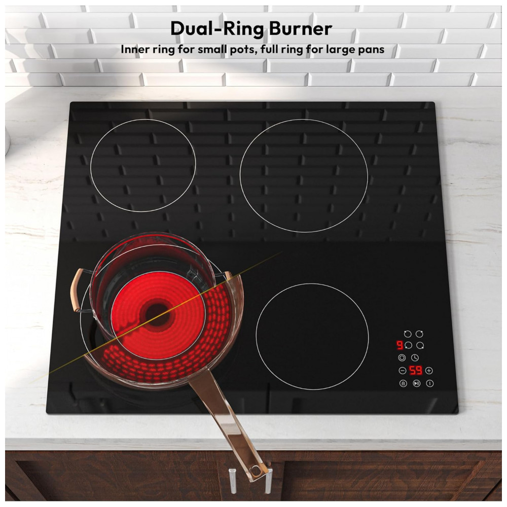 O cooktop elétrico radiant Empava 59cm em vidro cerâmico preto é de embutir e conta com quatro zonas de aquecimento elétrico, incluindo um queimador de zona dupla que se ajusta ao tamanho da panela. A mesa em vidro liso com comandos touch permite controlar potência, temporizadores individuais, função Stop&Go e trava de segurança, oferecendo operação precisa para diferentes tipos de preparo no dia a dia.