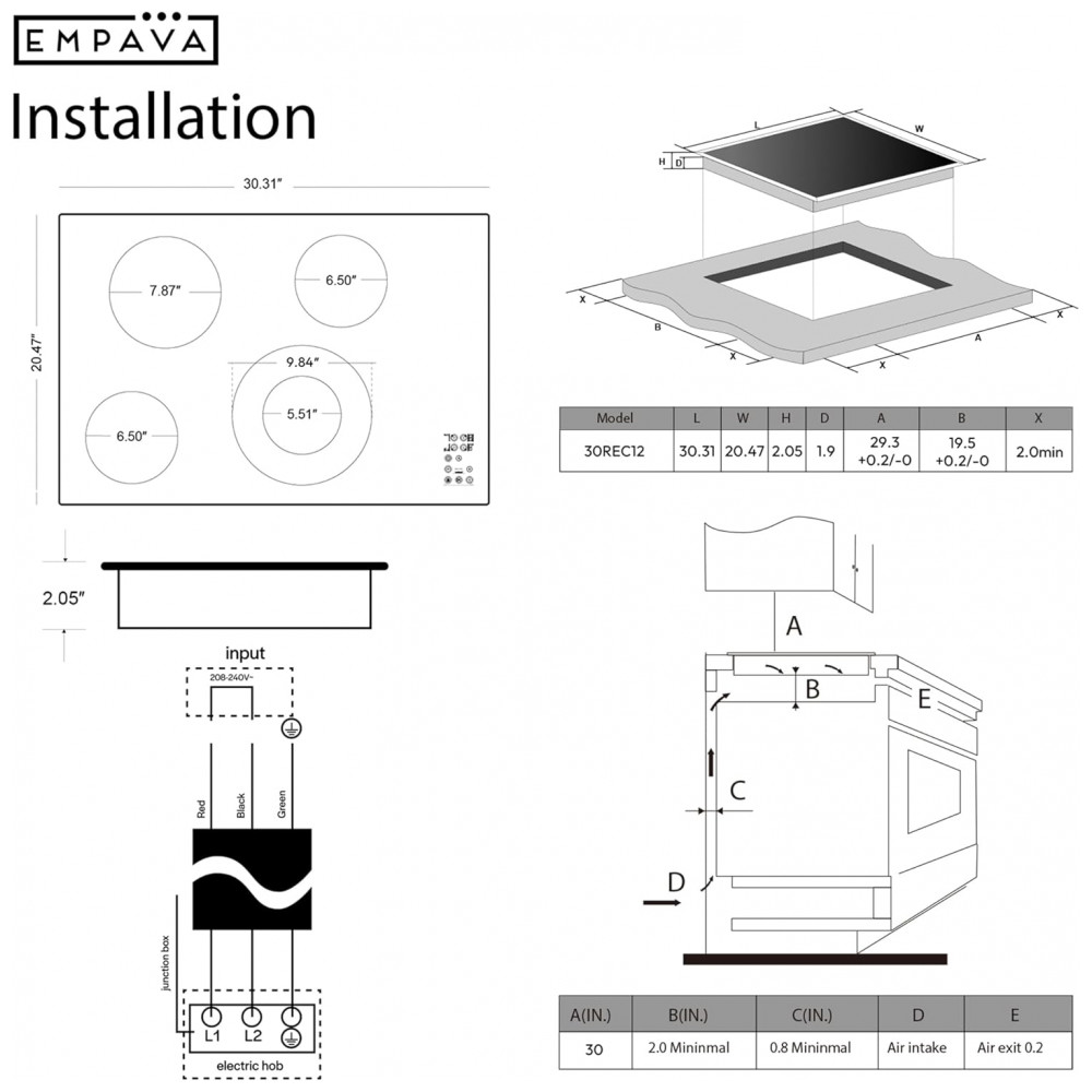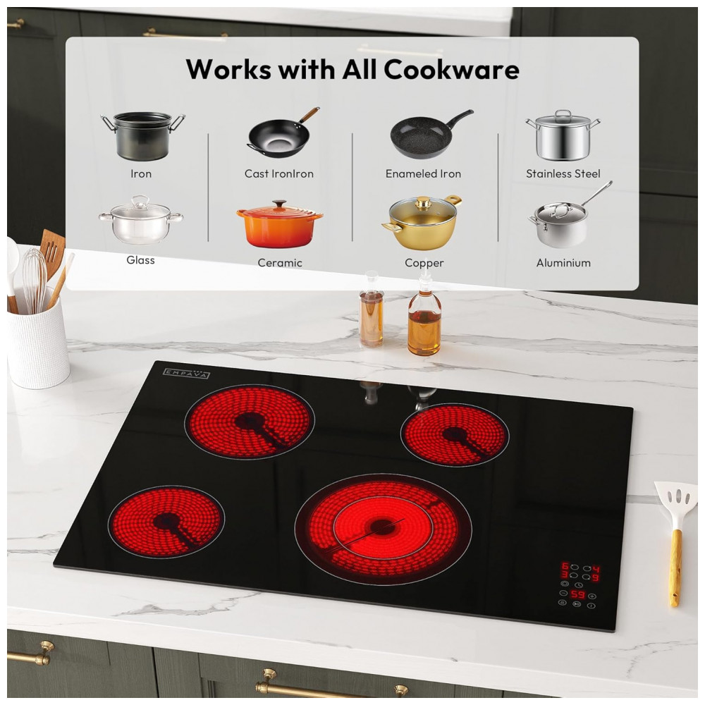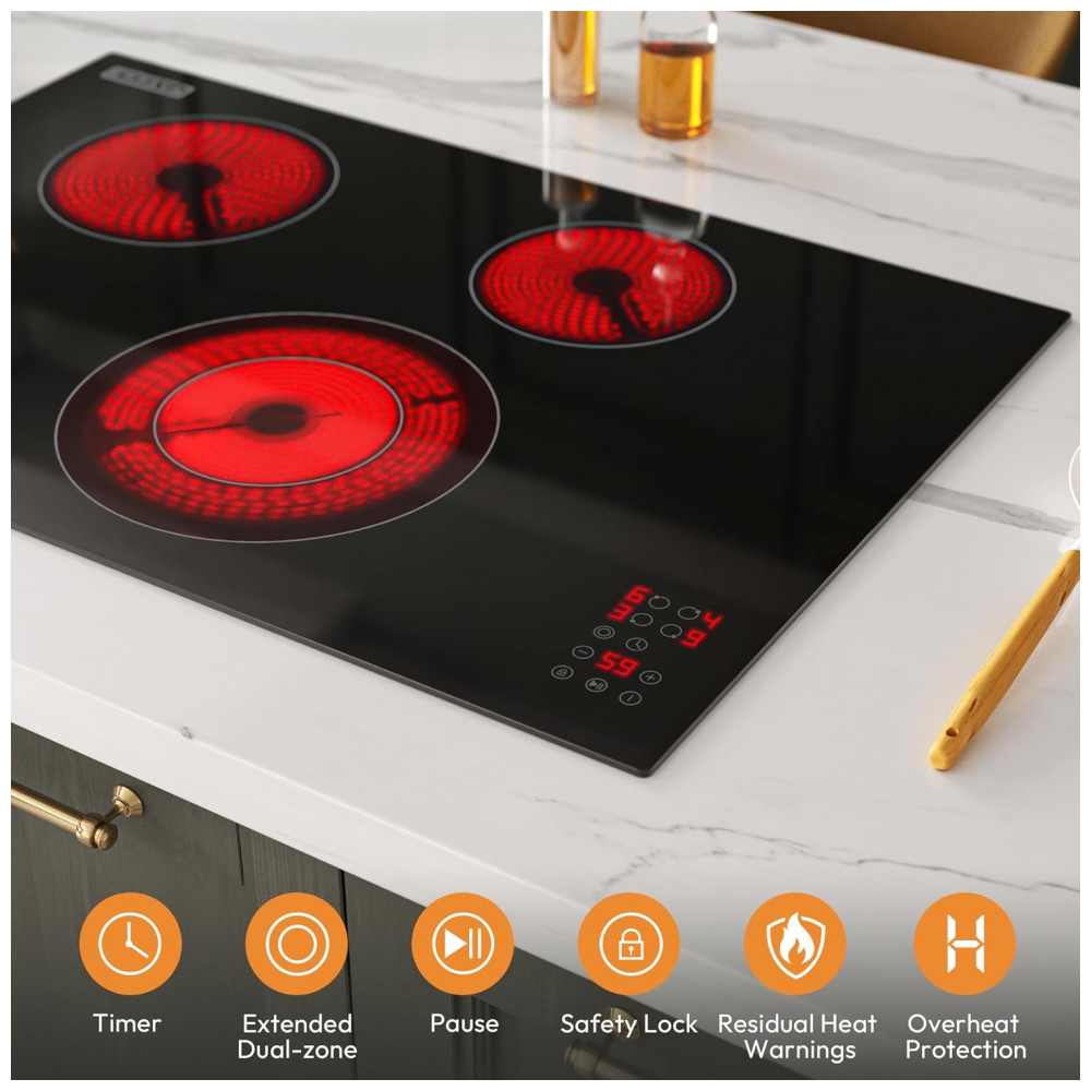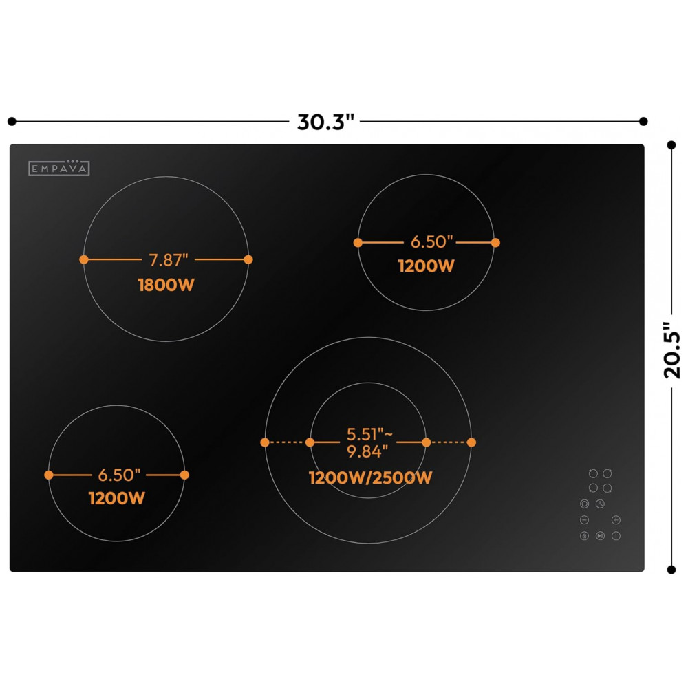 Cooktop elétrico radiant 77cm Empava 4 zonas vidro preto zona dupla Stop&Go 6700W 220V