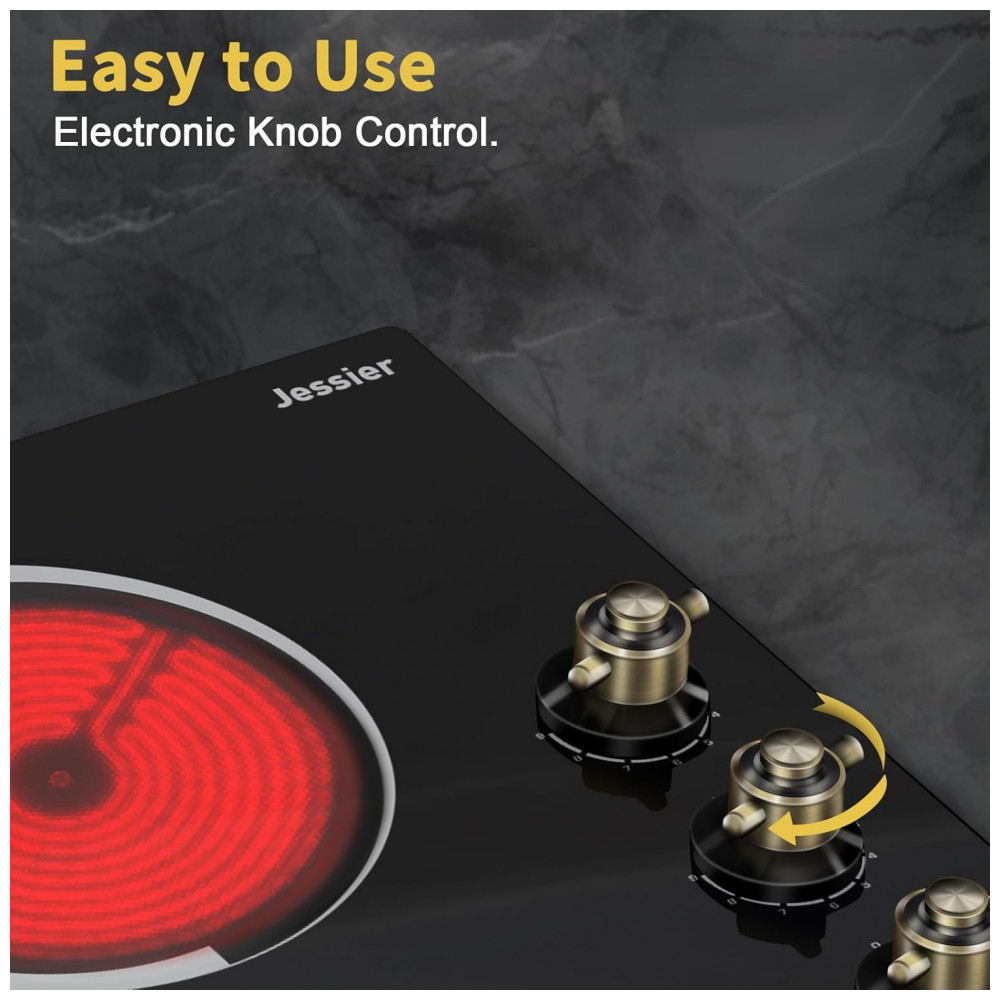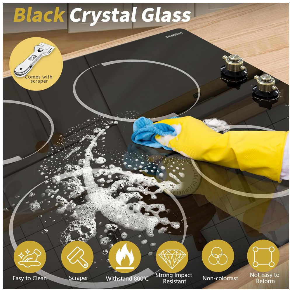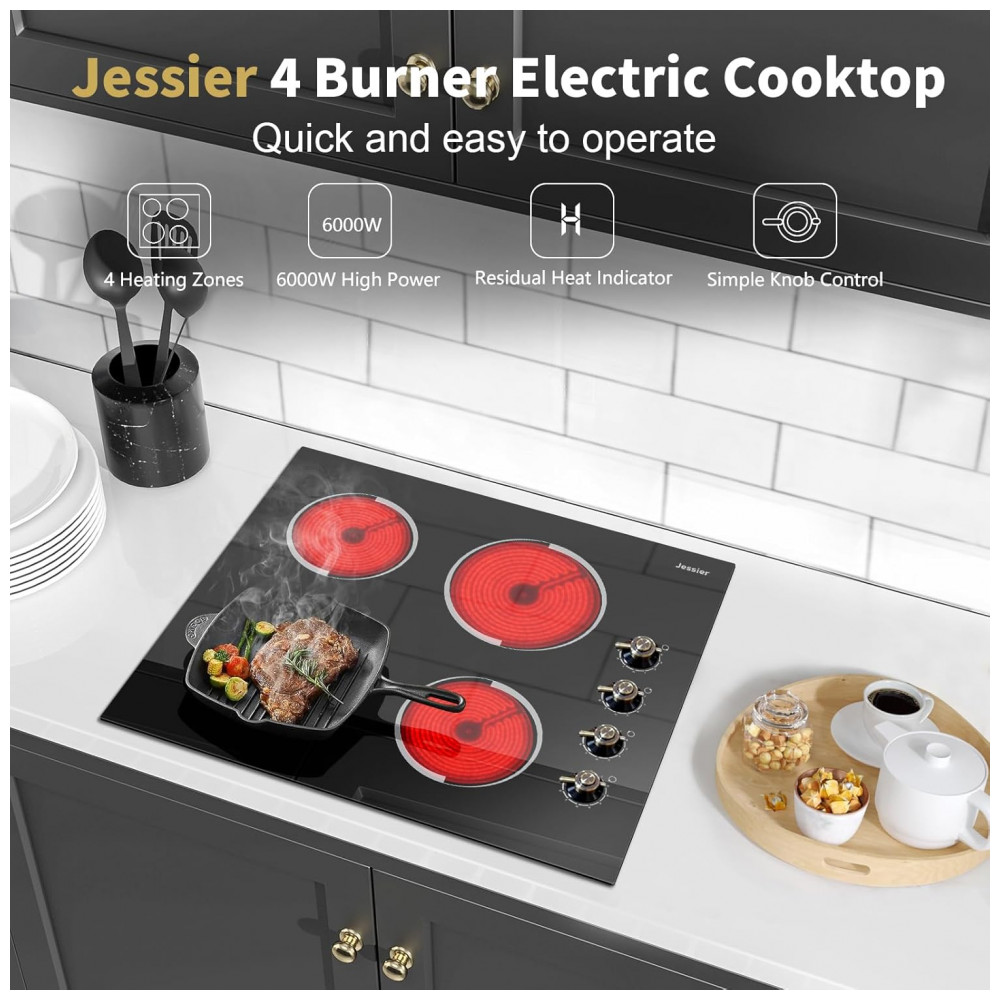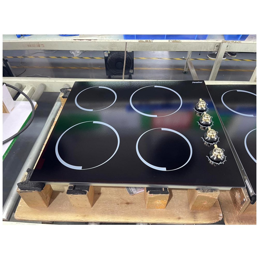 O cooktop elétrico vitrocerâmico Jessier de 4 zonas foi desenvolvido para instalação embutida em bancadas, com superfície em vidro temperado preto e design compacto para cozinhas planejadas. A largura aproximada de 61 cm oferece quatro áreas de aquecimento, permitindo preparar diferentes receitas ao mesmo tempo em uma área útil otimizada.
