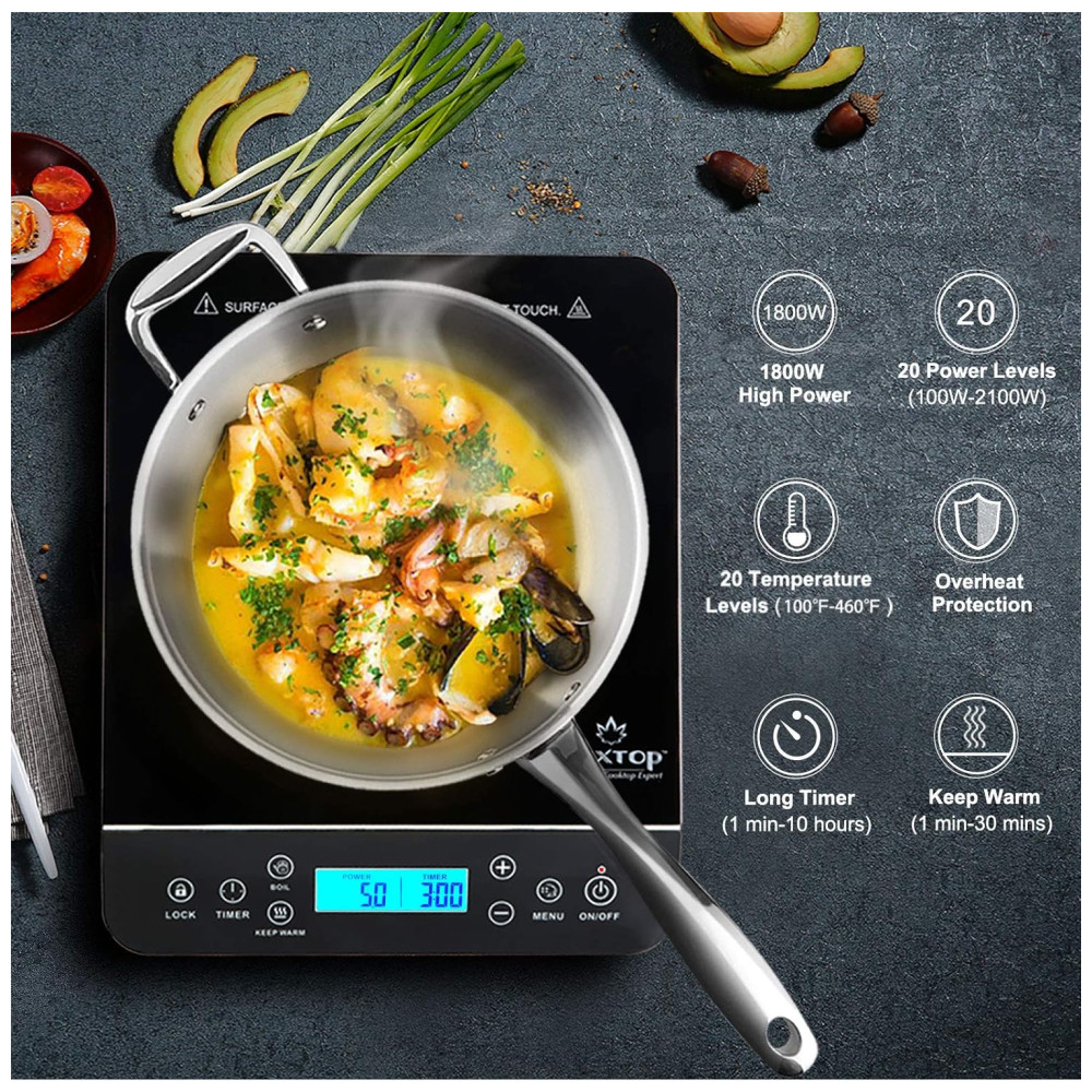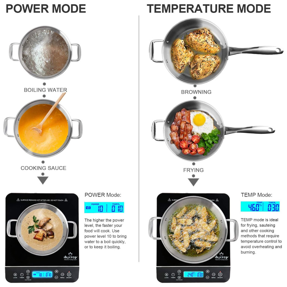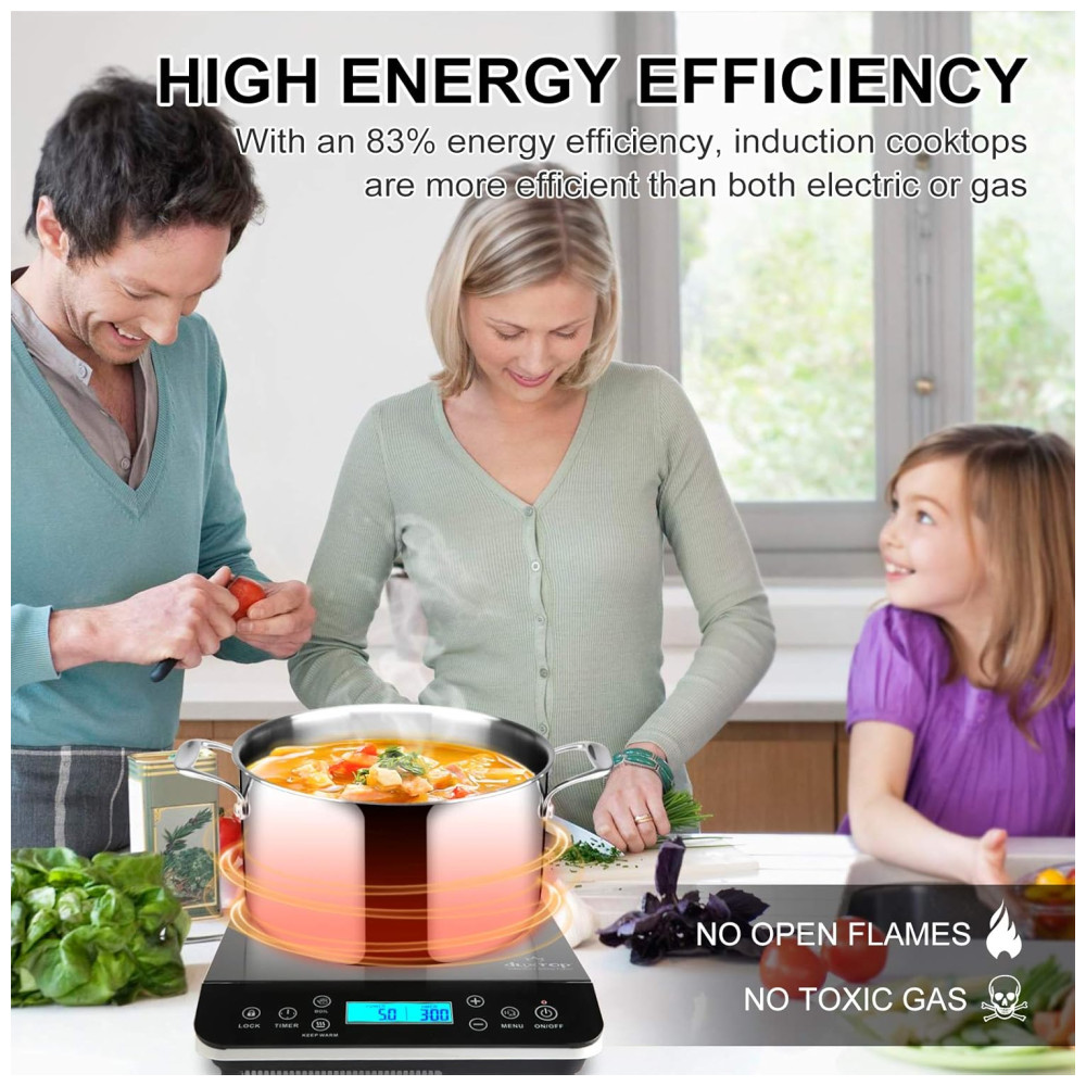 ALTA EFICIÊNCIA ENERGÉTICA: Escolha entre 20 níveis de potência pré-programados (100W a 1800W) e 20 configurações de temperatura pré-programadas (38°C a 238°C). Com uma eficiência energética de 83%, o cooktop de indução é mais eficiente do que fogões a gás ou elétricos tradicionais. O cooktop portátil Duxtop é perfeito para ferver água rapidamente e para todas as suas necessidades de cozimento.