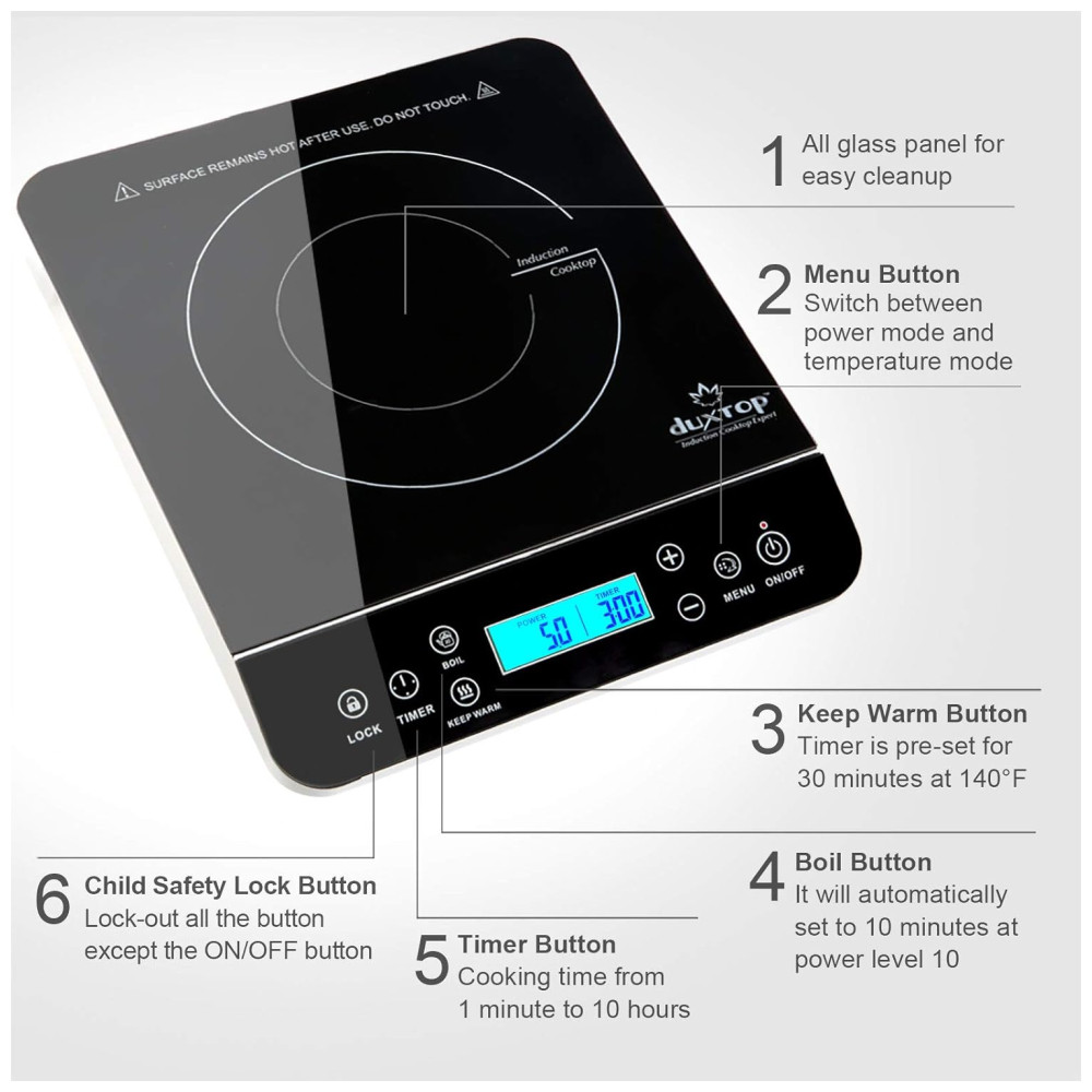 COOKTOP DE INDUÇÃO PORTÁTIL: O cooktop de indução Duxtop usa uma tomada elétrica de 110/120V e 15 ampères, padrão em todas as casas da América do Norte. Listado pela ETL e construído de acordo com os padrões elétricos norte-americanos. Leve e compacto, é fácil de manusear e armazenar. O cooktop de indução portátil é perfeito para cozinhas, dormitórios, RVs, barcos, etc.