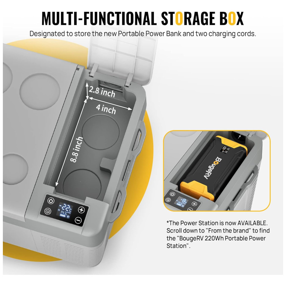Caixa de zenamento generosa acomoda perfeitamente a estação de energia e acessórios O refrigerador CRPRO de 21 litros possui uma caixa de zenamento multifuncional onde você pode colocar a NOVA ESTAÇÃO DE ENERGIA PORTÁTIL para geladeiras ou os cabos de carregamento equipados dentro, o que aumenta o tempo de uso da geladeira e evita a falta de cabos. Pesquise BougeRV 220WH PORTABLE POWER STATION na se estiver procurando.
