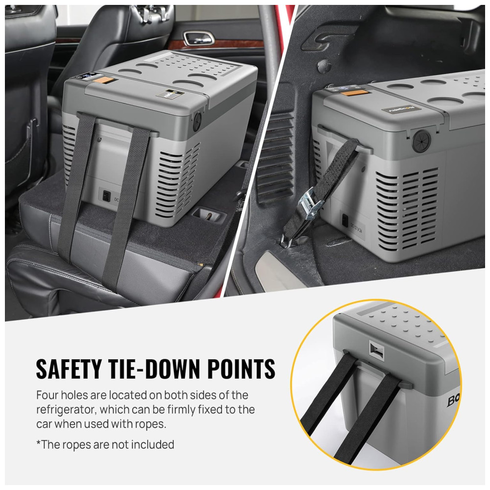 4 pontos de amarração de segurança fixa a geladeira ao seu carro Através de quatro orifícios localizados em ambos os lados da geladeira CRPRO, ela pode ser presa com segurança com cordas na caminhonete, assento e outras superfícies escorregadias. Não precisa se preocupar com o movimento da geladeira quando você dirige o carro.