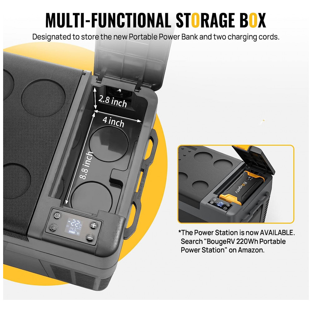 Caixa de zenamento generosa acomoda perfeitamente a estação de energia e acessórios O refrigerador CRPRO de 30 Litros possui uma caixa de zenamento multifuncional onde você pode colocar a NOVA ESTAÇÃO DE ENERGIA PORTÁTIL para geladeiras ou os cabos de carregamento equipados dentro, o que aumenta o tempo de uso da geladeira e evita a falta de cabos. Pesquise BougeRV 220WH PORTABLE POWER STATION na se estiver procurando.