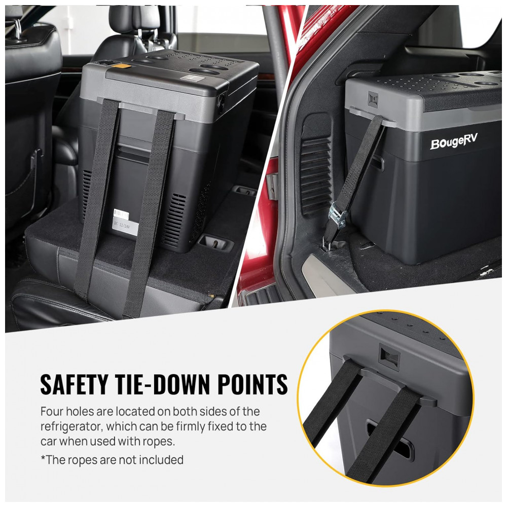 4 pontos de amarração de segurança fixa a geladeira ao seu carro Através de quatro orifícios localizados em ambos os lados da geladeira CRPRO, ela pode ser presa com segurança com cordas na caminhonete, assento e outras superfícies escorregadias. Não precisa se preocupar com o movimento da geladeira quando você dirige o carro.