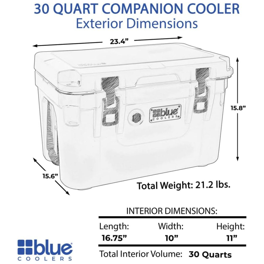 PREPARAR. DEFINIR. JORNADA O refrigerador da série Blue Coolers 30 Litros Companion aguentará o abuso mais difícil devido à melhor durabilidade da classe. Se você precisa simplesmente manter o sol afastado em um jogo de futebol ou precisa de um refrigerador que possa suportar ursos, insetos e a vida selvagem ao ar livre, o refrigerador de acampamento Blue Coolers fará isso