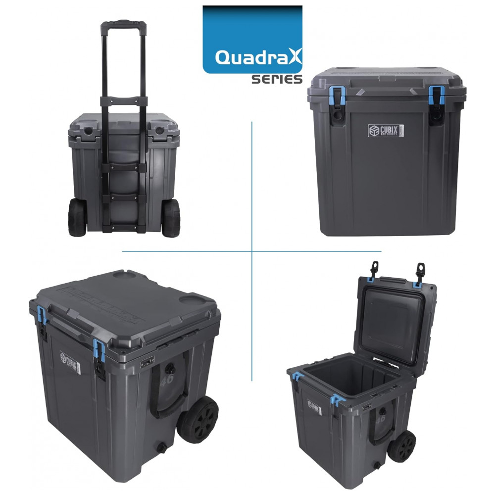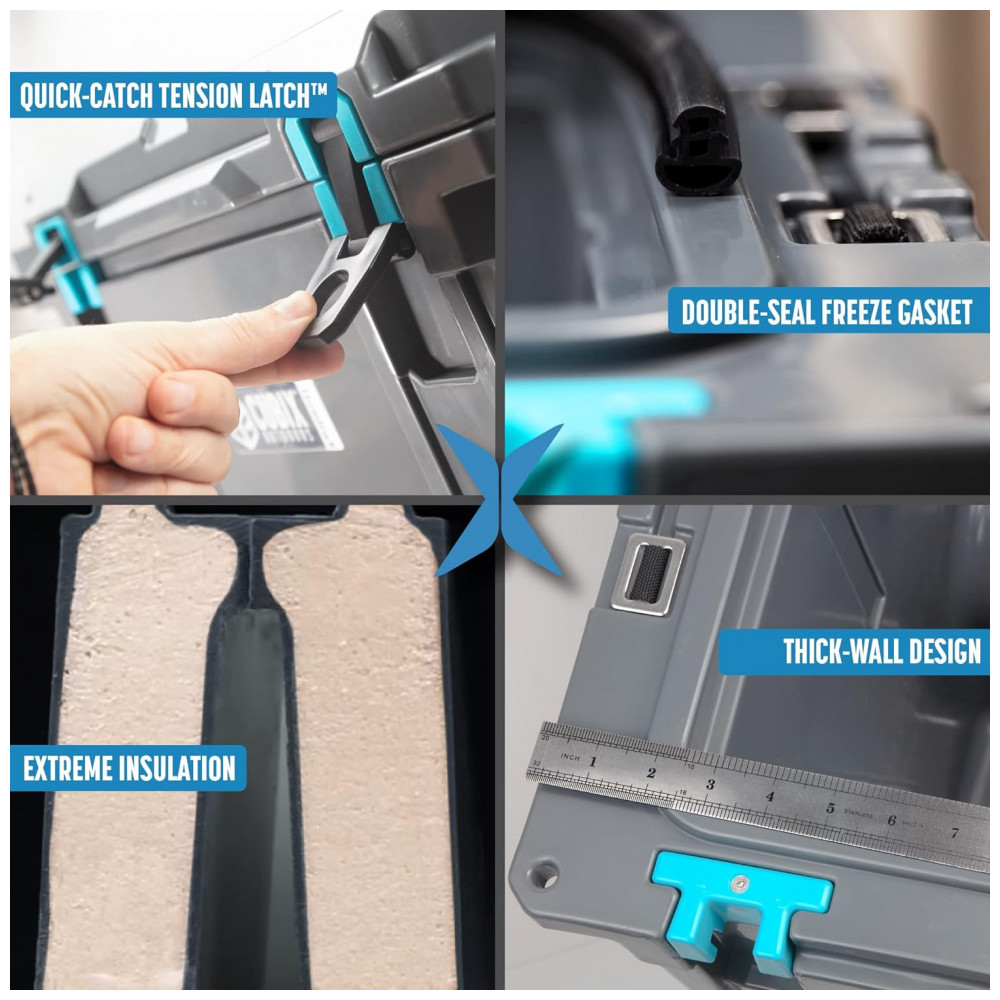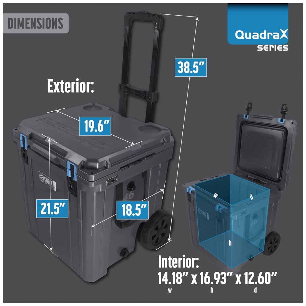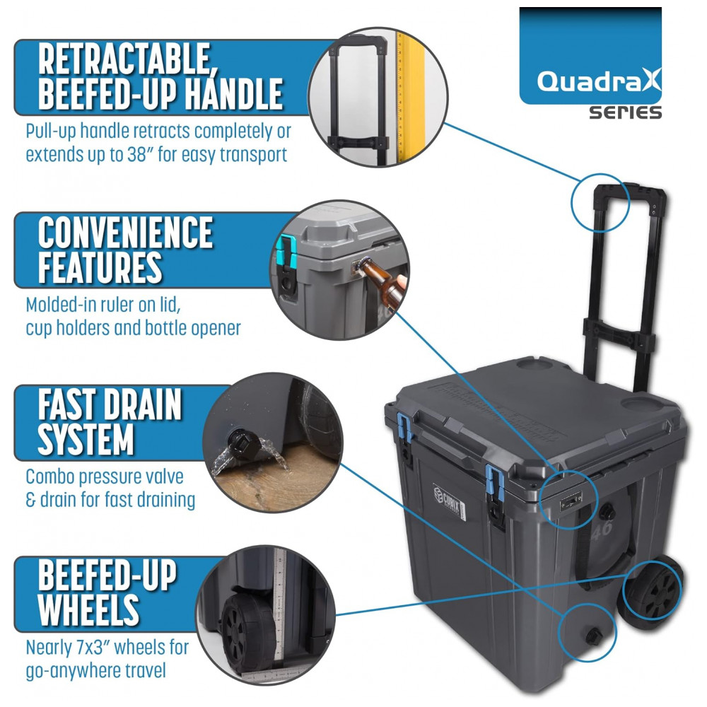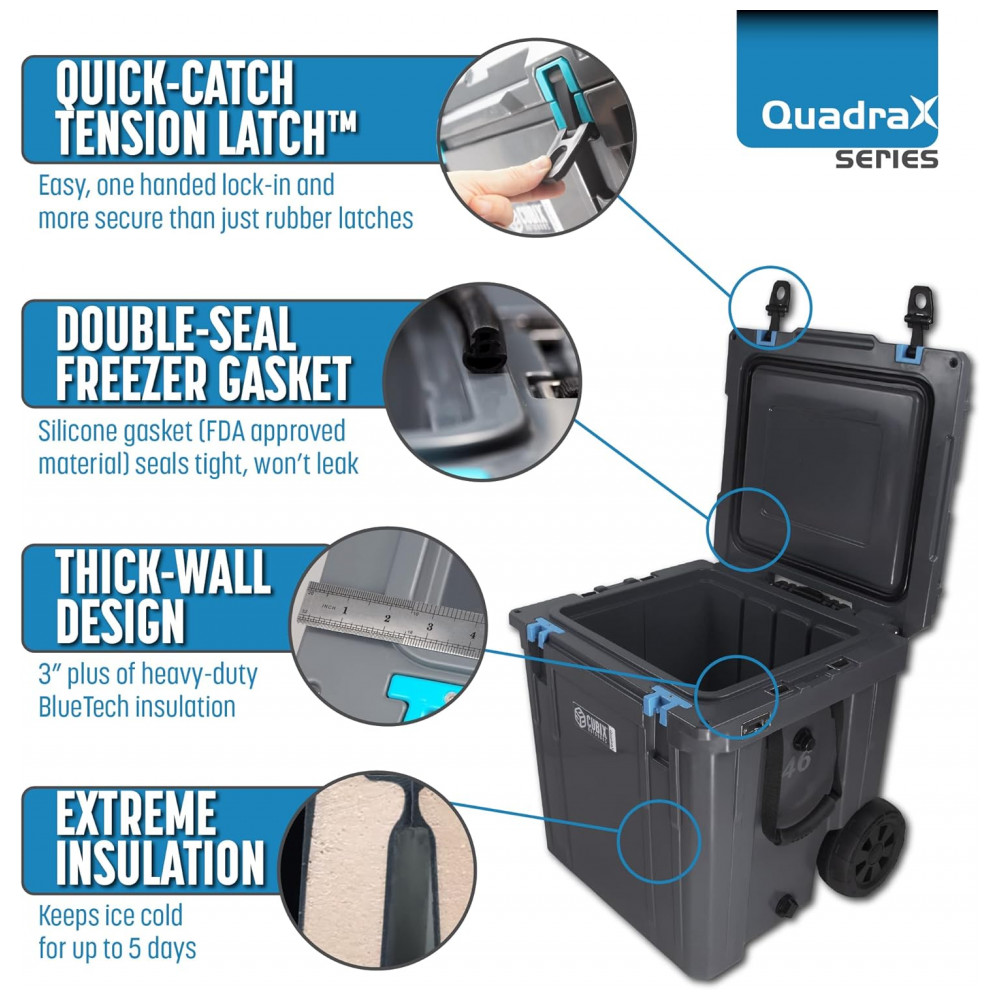 RETENÇÃO DE FRIO DE 5 DIAS O refrigerador de rolamento QuadraX manterá seu conteúdo fresco por até 5 dias com nosso design lateral de parede grossa com de isolamento superior impressionante capacidade de carga de até 26 latas com uma proporção recomendada de 21 gelo, conteúdo.