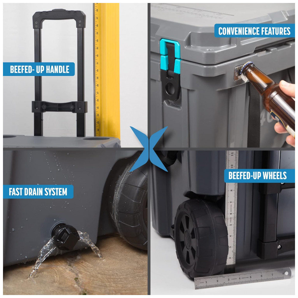 PORTÁTIL E RESISTENTE Construção rotomoldada, este cooler ártico é virtualmente indestrutível tem uma alça telescópica retrátil, rodas de 17x e alças laterais para facilitar o transporte, seja para pescar, fazer uso não autorizado, acampar ou fazer churrasco no quintal