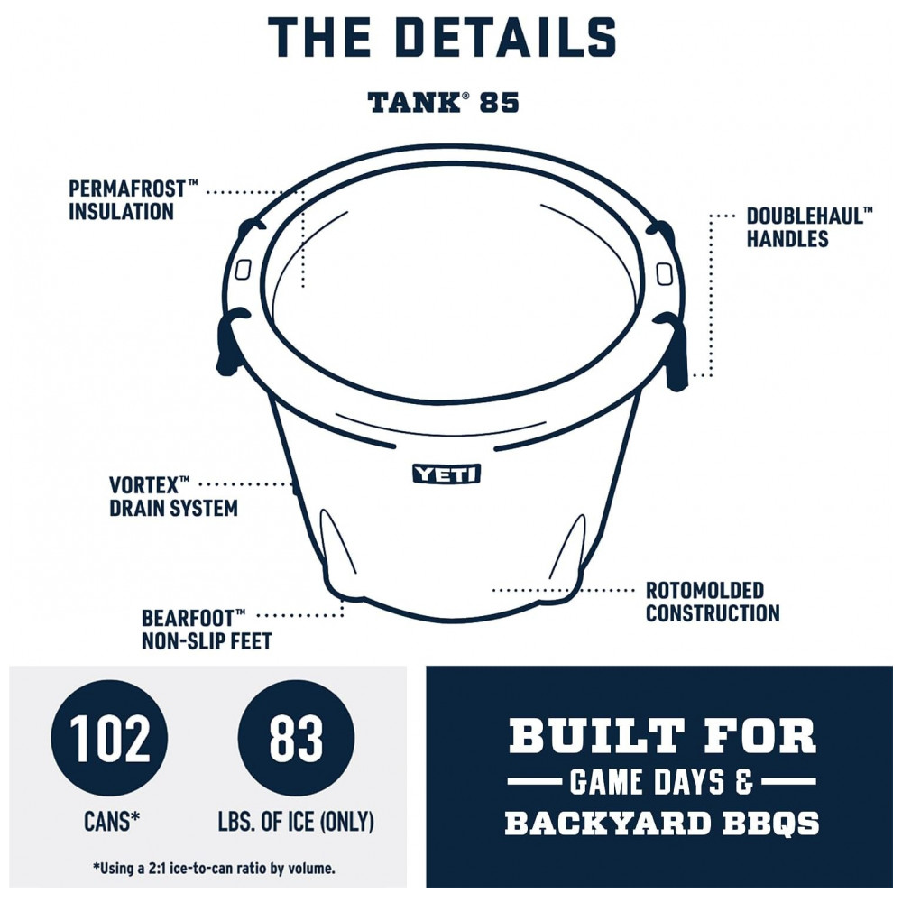 O YETI TANK 85 pode acomodar até 60 longnecks, 51 caranguejos azuis, 24 tainhas e menhaden, 98 fatias de melancia, 20 galões de ponche de lata de lixo ou 2 alqueires de ostras.