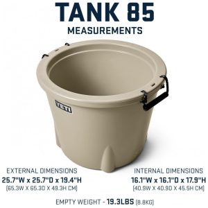 O YETI TANK 85 pode acomodar até 60 longnecks, 51 caranguejos azuis, 24 tainhas e menhaden, 98 fatias de melancia, 20 galões de ponche de lata de lixo ou 2 alqueires de ostras.
