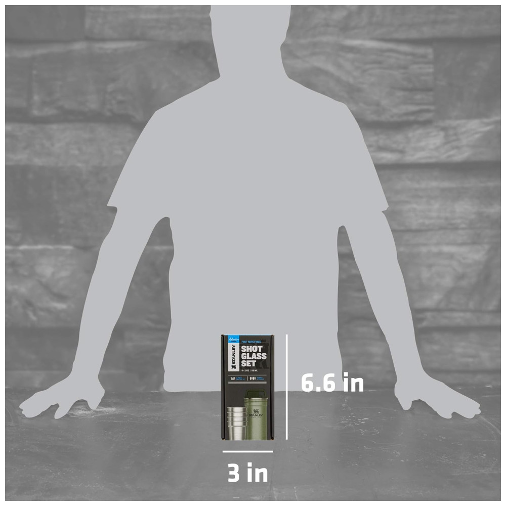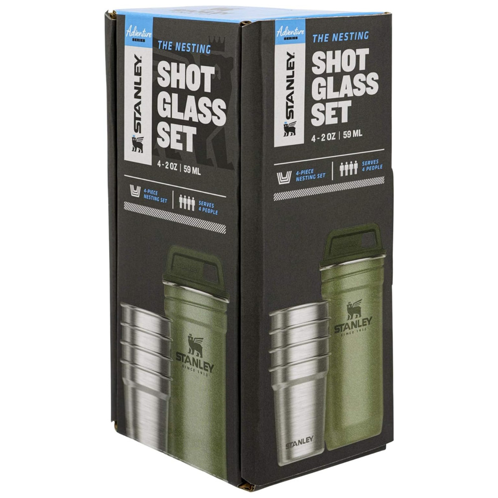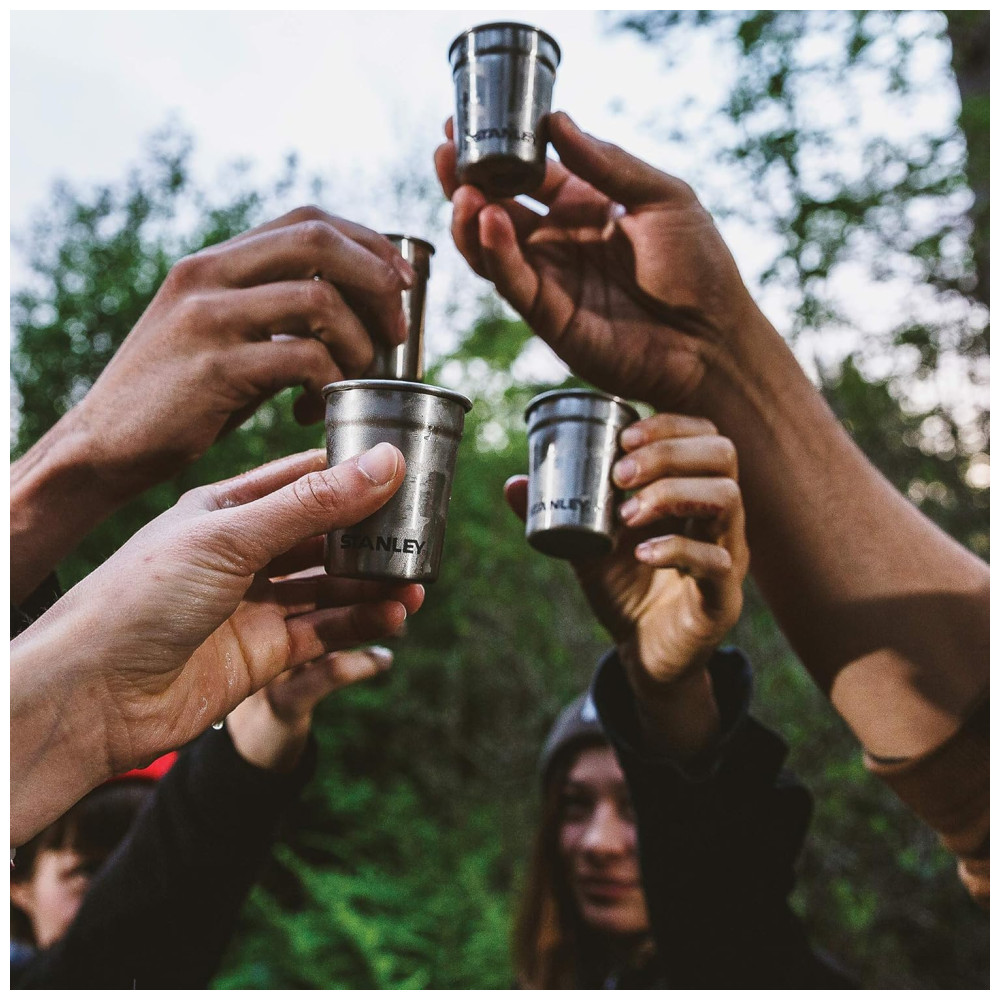 FESTA NO SELVAGEM Onde quer que você esteja, o conjunto de copos de shot Stanley lhe dá a liberdade de comemorar. Você receberá 4 copos de shot de aço inoxidável e uma maleta de transporte igualmente durável para apimentar qualquer viagem de acampamento, pesca ou mochila.