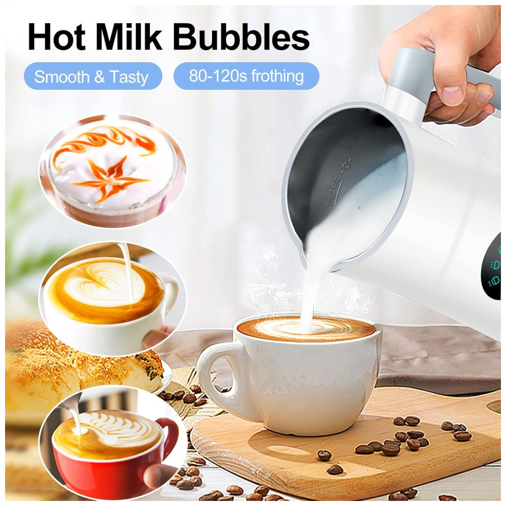 Nosso vaporizador de leite elétrico multifuncional faz espuma rapidamente. Pode transformar até 350 ml de leite numa espuma de leite quente e densa ou numa espuma de leite fria. Apenas necessita de premir as 4 teclas de função correspondentes no espumador de leite, pode desfrutar de 160 ml de espuma de leite quente e fria. Aquecimento de leite 350ML e função de leite com chocolate quente. Recomenda se usar leite integral, teor de gordura 3 para melhor resultado.