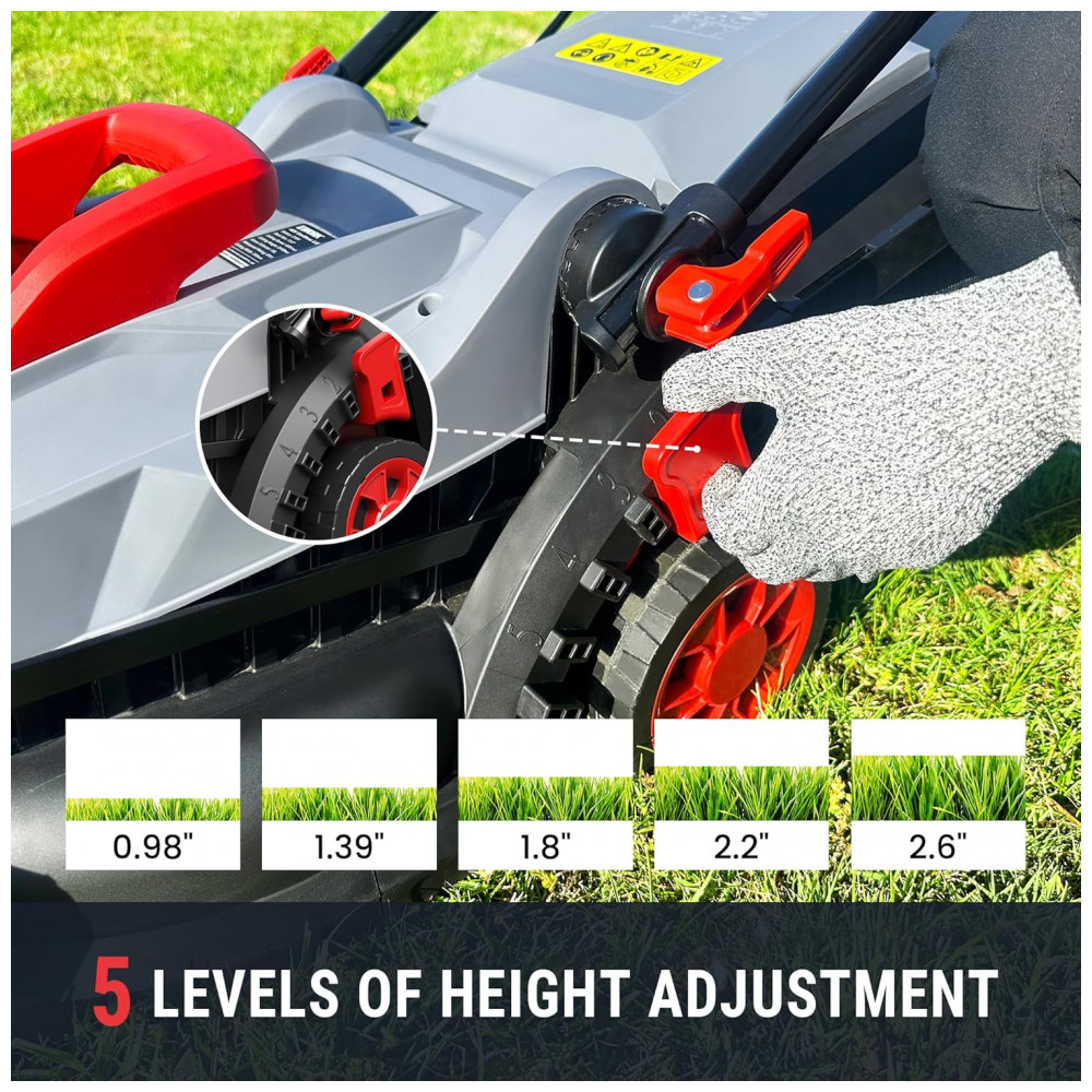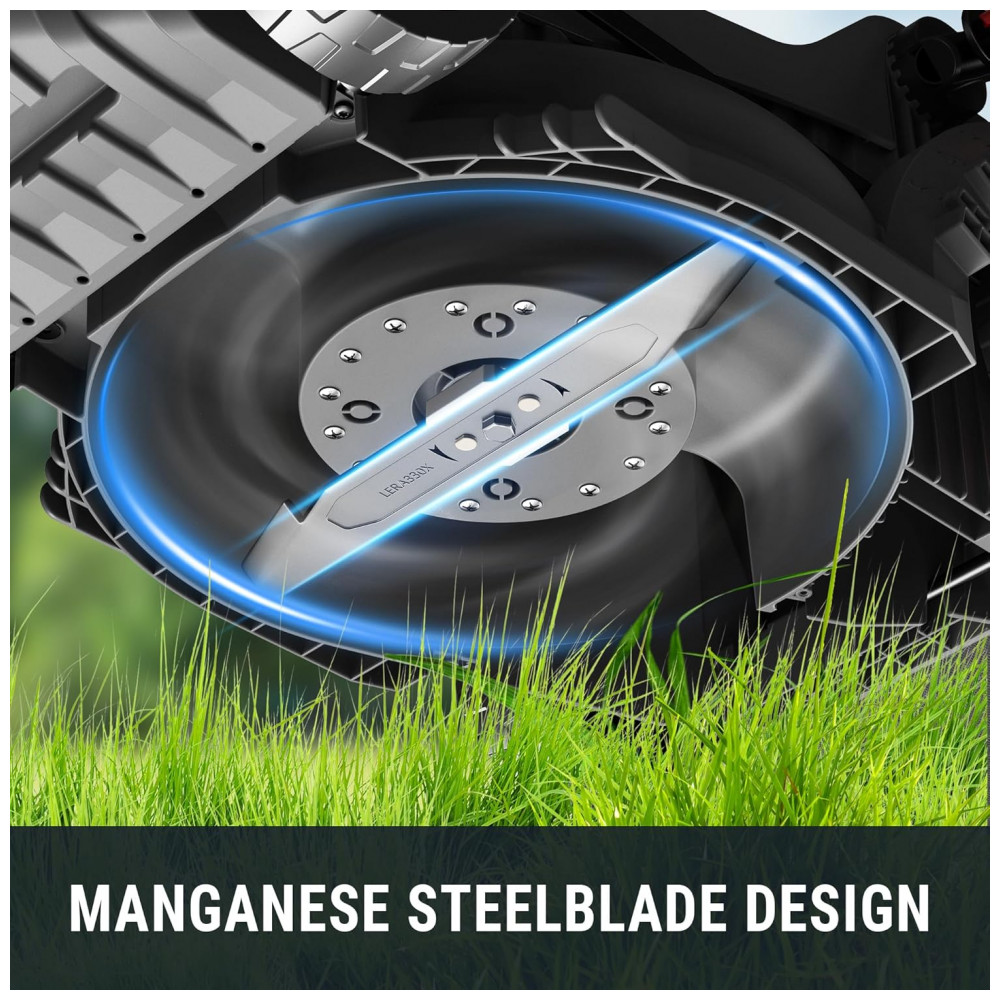 O cortador de grama elétrico sem fio EWORK 40V 2 X 20V é alimentado por um motor de alta velocidade sem escovas de 4500 RPM, com baixo ruído de 90 dB, permitindo um corte silencioso. Fuja do barulho da gasolina, não perturbe os vizinhos e aproveite uma experiência eficiente de corte. Com tempo de trabalho de até 45 minutos, o cortador de grama EWORK inclui 2 baterias de íon de lítio de alta capacidade de 4.0AH com carregador certificado pela UL. Design compacto e leve, pesando apenas 16 kg sem baterias, permitindo fácil manuseio em subidas e perfeito para espaços mais estreitos. Ajuste de altura de corte em 5 posições.