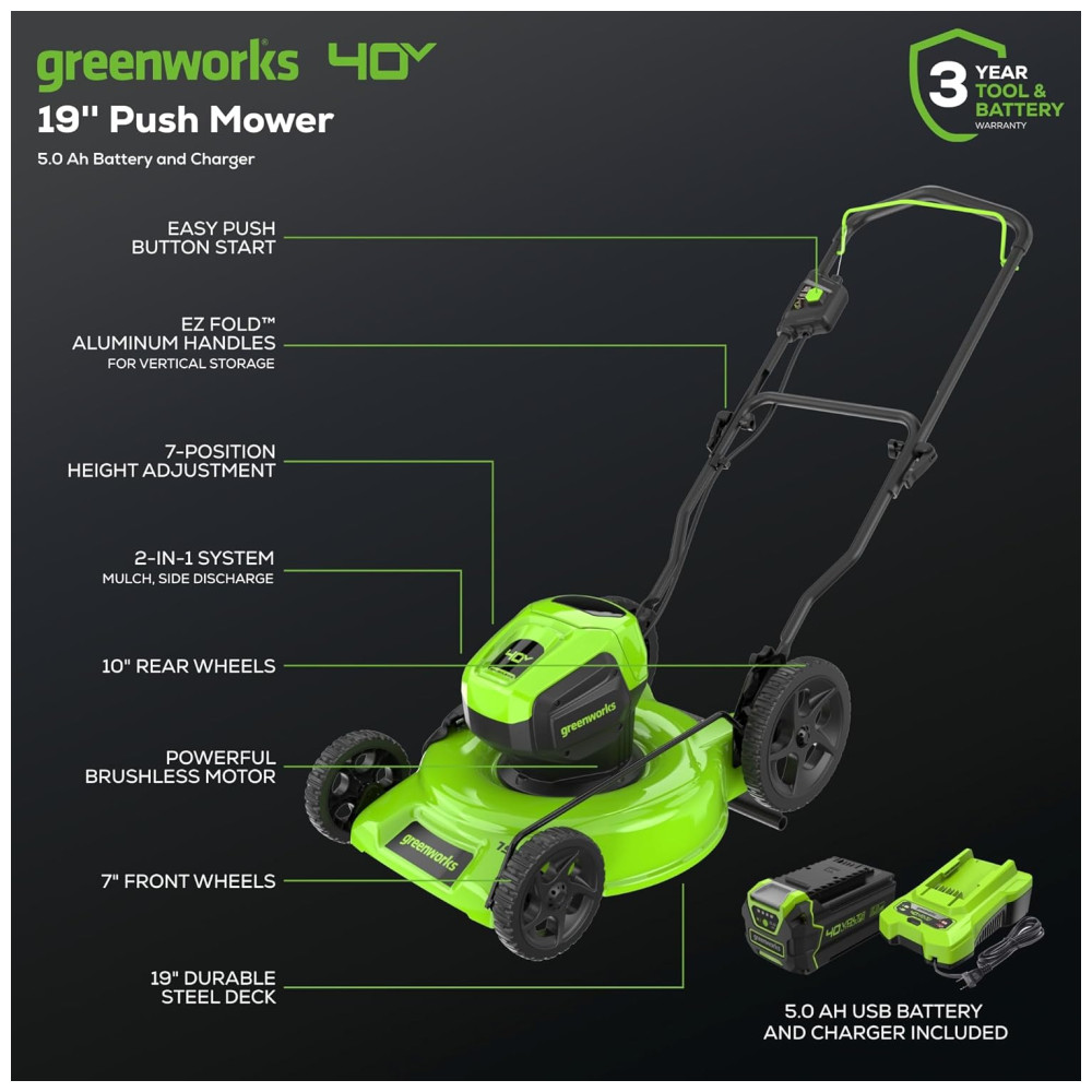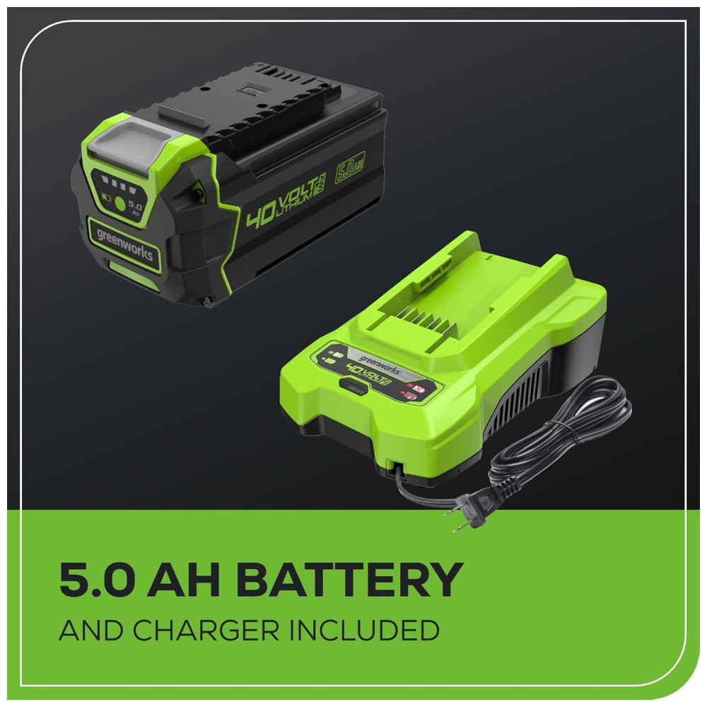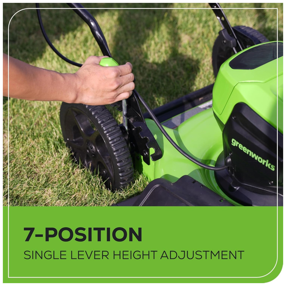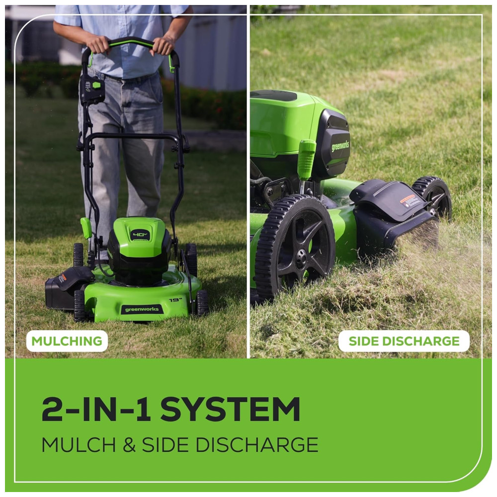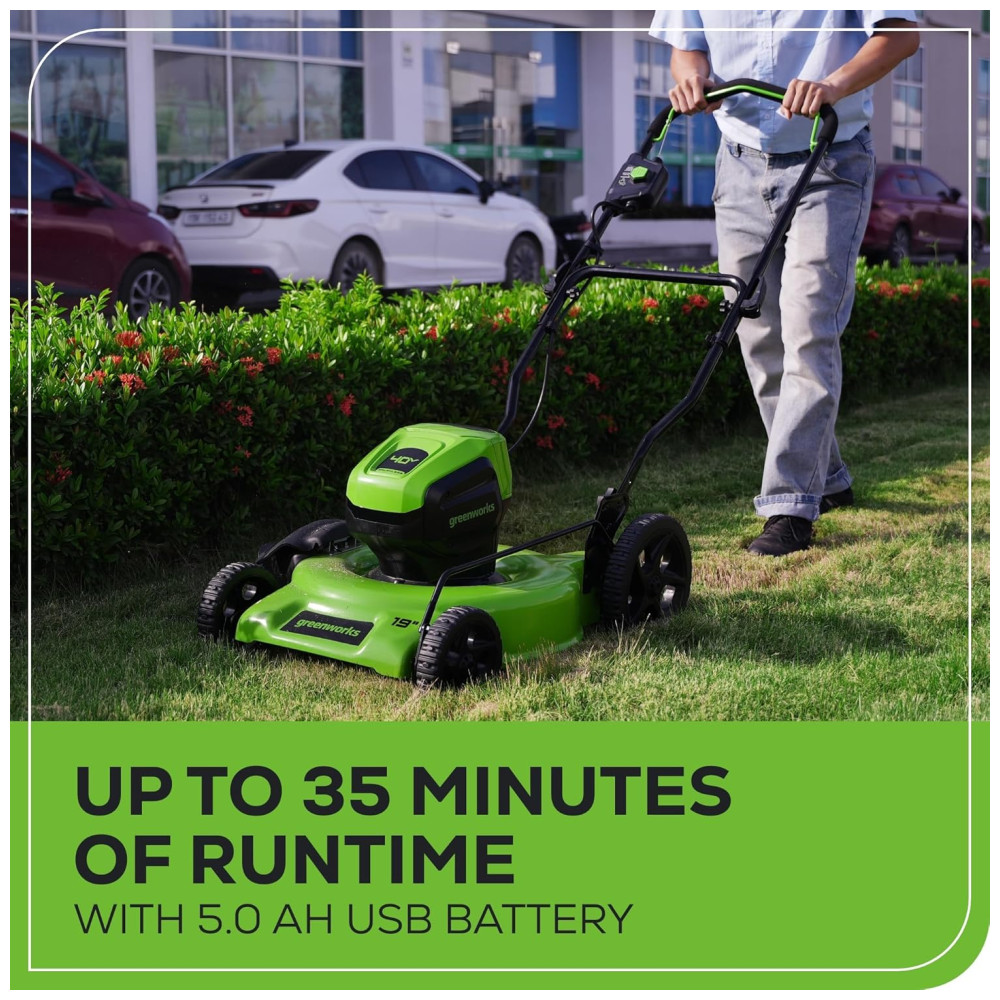 Facilite seu dia de trabalho no jardim com o cortador de grama Greenworks 40V. Este cortador de grama ecológico oferece a potência necessária com até 35 minutos de autonomia com a bateria de 5.0Ah totalmente carregada (a autonomia varia de acordo com a condição da grama e operação do usuário). O resistente deck de aço deste cortador de grama sem fio permite que você lide rapidamente com grandes áreas de grama. Além disso, o motor sem escovas oferece mais torque, funcionamento silencioso e longa vida útil. O ajuste de altura de 7 posições com alavanca única e fácil de usar oferece o melhor corte em qualquer ambiente. A função 2 em 1 oferece um uso versátil com opções de mulching e descarga lateral para ajudar na gestão dos aparos. Este cortador de grama é praticamente livre de manutenção e inicia instantaneamente com um simples botão de partida. Sem gasolina, sem óleo e sem emissões, mas com muita potência. Além disso, as portas USB estão integradas na bateria, transformando-a em um carregador portátil para celulares, tablets e outros acessórios eletrônicos compatíveis. Acompanha cortador de grama elétrico sem fio, bateria de 40V 5.0Ah, carregador e manual do operador.