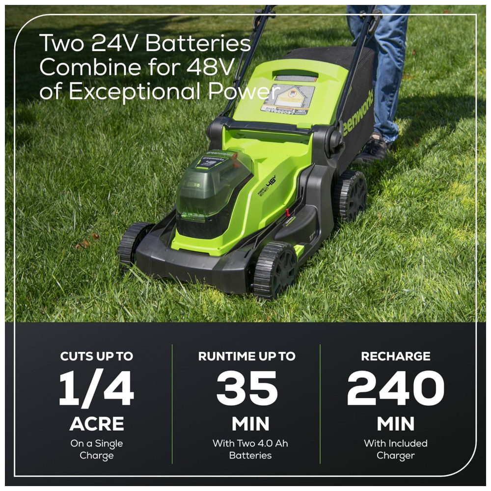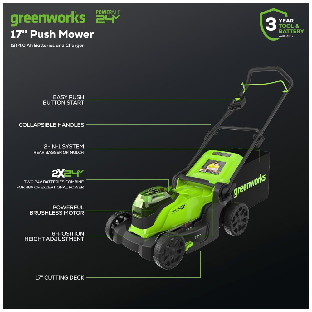 Cortador de Grama Elétrico Greenworks 48V 2 x 24V 17″ Inclui 2 Baterias 4.0Ah e Carregador Rápido de Dupla Porta Ideal para Jardins de Médio a Grand