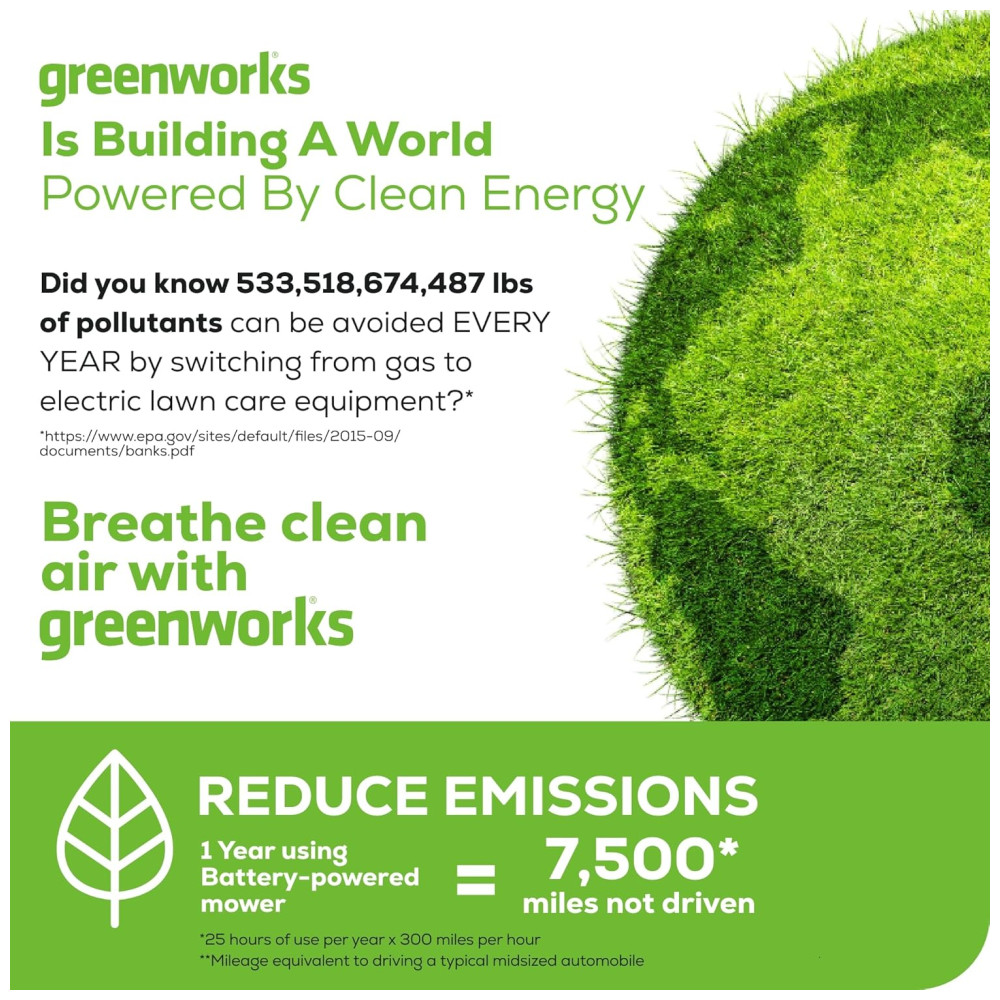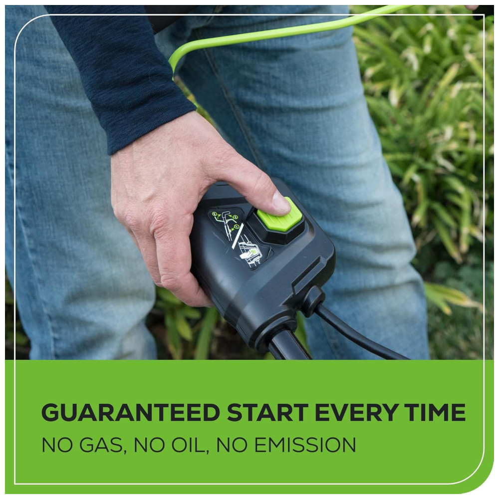 Enfrente gramados difíceis com o Cortador de Grama Greenworks 48V 2 x 24V, projetado para eficiência e conveniência. Alimentado por duas baterias de íon de lítio de 24V 4.0Ah, este cortador oferece até 45 minutos de autonomia robusta, o que varia de acordo com as condições e uso da grama para cobrir jardins médios a grandes em uma carga. O carregador rápido de dupla porta incluído garante recargas rápidas, para que você nunca fique parado por muito tempo. Diga adeus a gasolina, óleo, fumaça e motores barulhentos! Este cortador de grama elétrico, livre de manutenção, inicia instantaneamente com um botão e opera em níveis de ruído ultra silenciosos. Desfrute de uma potência semelhante à de gasolina sem a bagunça, emissões ou barulho ensurdecedor. O que está incluído: Cortador de Grama Elétrico 48V, 2 baterias de 24V 4.0Ah necessárias, 2 baterias de íon de lítio de 24V 4.0Ah, Carregador Rápido de Dupla Porta, Saco traseiro para resíduos cortados. Realize mais tarefas, mais rapidamente, com os cortadores de grama elétricos da Greenworks. Este cortador de grama 48V corta até 1/4 de acre com 2 baterias 4.0Ah totalmente carregadas, variando com base na condição da grama e na técnica do operador. MOTOR SEM ESCOVAS: Este cortador elétrico apresenta um resistente deck de 17″ e um motor sem escovas altamente eficiente que oferece mais torque, funcionamento silencioso e maior vida útil. SISTEMA 2 EM 1: Mantenha o jardim limpo com a opção de triturar ou coletar na parte traseira. AJUSTE DE ALTURA DE ALAVANCA ÚNICA: O ajuste de altura de 6 posições oferece o melhor corte em todos os ambientes. LIVRE DE MANUTENÇÃO: O cortador de grama é praticamente livre de manutenção, sem gasolina, sem óleo e sem emissões. Ele inicia instantaneamente, é silencioso e fornece a potência que você precisa.