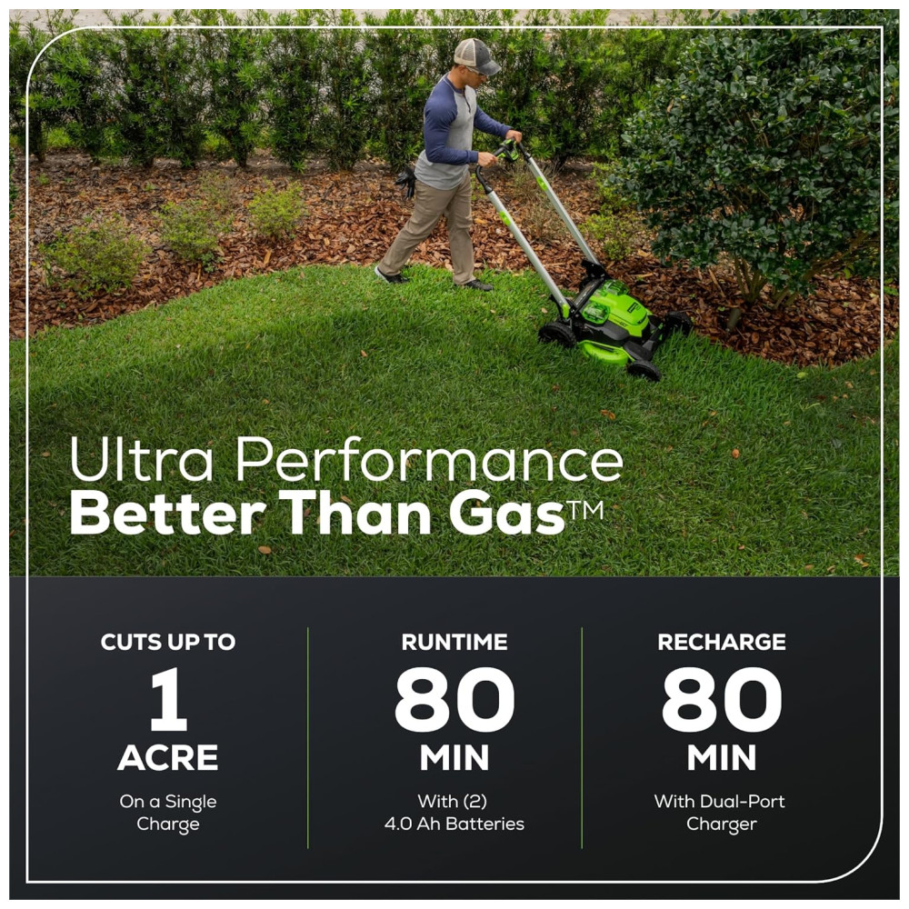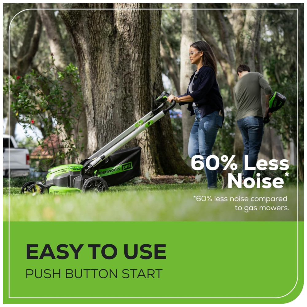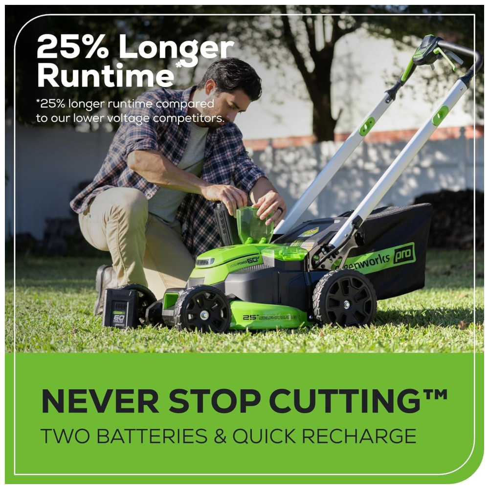 Corte rapidamente até 34 de um acre em uma única carga com o Cortador de Grama Autopropelido Greenworks Pro 60V Sem Escova, a Bateria Sem Fio , 2 Baterias de 4.0 Ah, Carregador de Duas Portas, MO60L427, e recarregue totalmente as baterias em apenas 80 minutos. Vencedor do prêmio de Melhor Cortador Sem Fio no Popular Mechanics Tool Awards de 2021, este cortador autopropelido de tração traseira, leve e silencioso, possui controle de velocidade variável para cortar a velocidades confortáveis, Tecnologia SmartCut que monitora constantemente as condições da grama e se adapta automaticamente para fornecer a quantidade perfeita de energia necessária para realizar o trabalho, lâminas de corte duplo que não travam em grama alta, úmida ou densa, e portas de bateria dupla com troca automática de bateria para tempos de execução mais longos. Recursos adicionais incluem faróis de LED de alta intensidade, sistema 2 em 1 de mulching e ensacamento. A exclusiva Tecnologia de Energia Inteligente da Greenworks fornece energia constante e sem desbotamento, sem emissões perigosas, combinando tecnologia de motor TruBrushless, energia de bateria de íon de lítio, corte superior e sistemas de controle ultra rápidos. Corte de Grama de 60V 25′: Oferece mais potência e desempenho do que os cortadores a gasolina típicos, sem o ruído, fumaça ou emissões nocivas. TEMPO DE EXECUÇÃO DE ATÉ 80 MINUTOS: Alcance até 80 minutos de tempo de execução, ou até 23 acres com as baterias de 4.0Ah incluídas. AUTOPROPELIDO: Conquiste colinas sem esforço com tração traseira autopropelida. 30% MELHOR MULCHING: Lâminas duplas oferecem 30% melhor mulching do que os cortadores de lâmina única. 50% MAIS POTÊNCIA, 60% MENOS RUÍDO: 50% mais potência do que os sistemas de bateria de 40V, e 60% menos ruído do que os cortadores a gasolina.