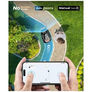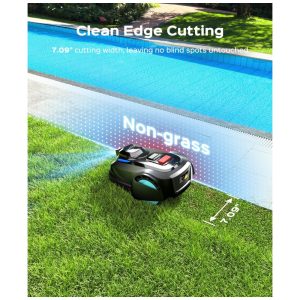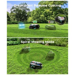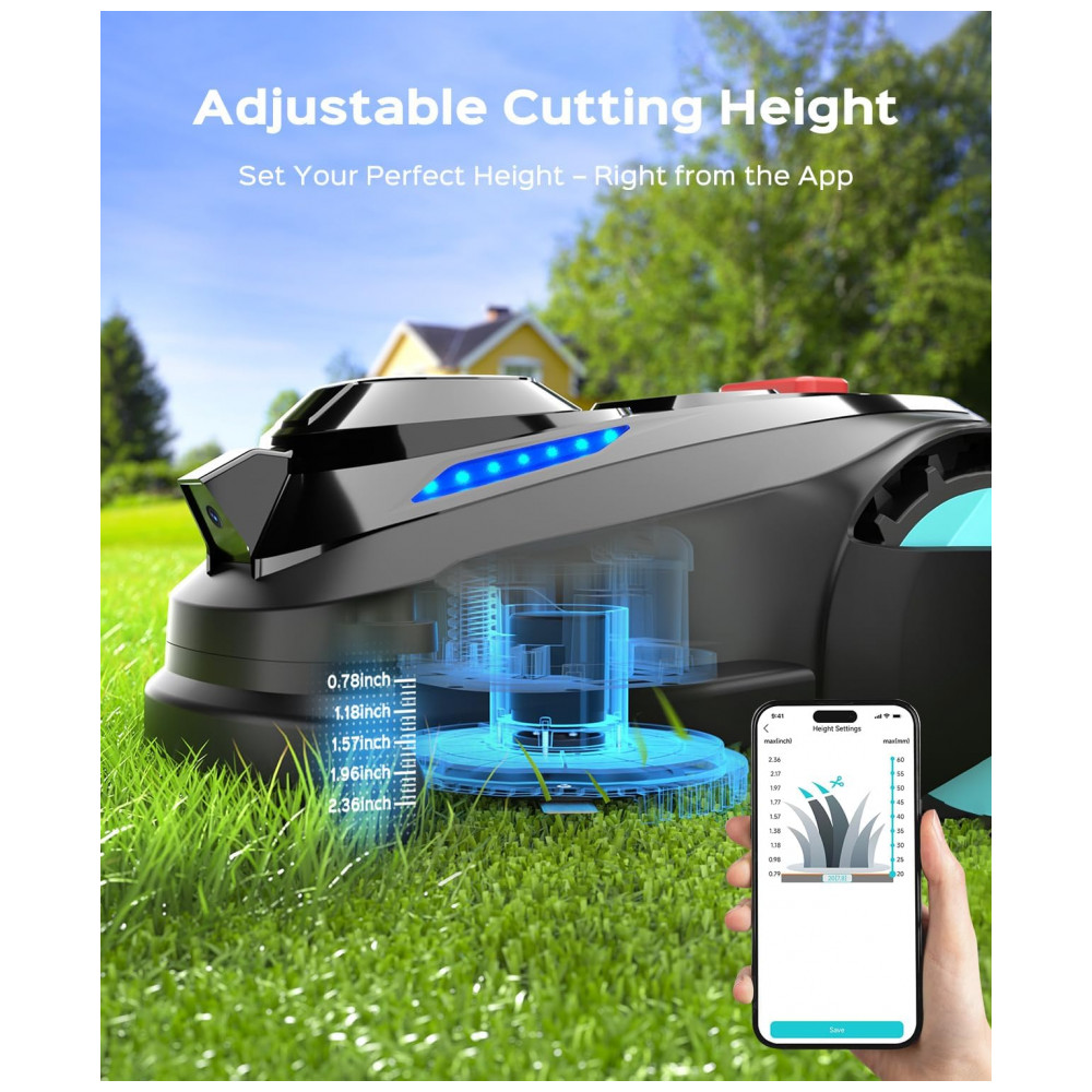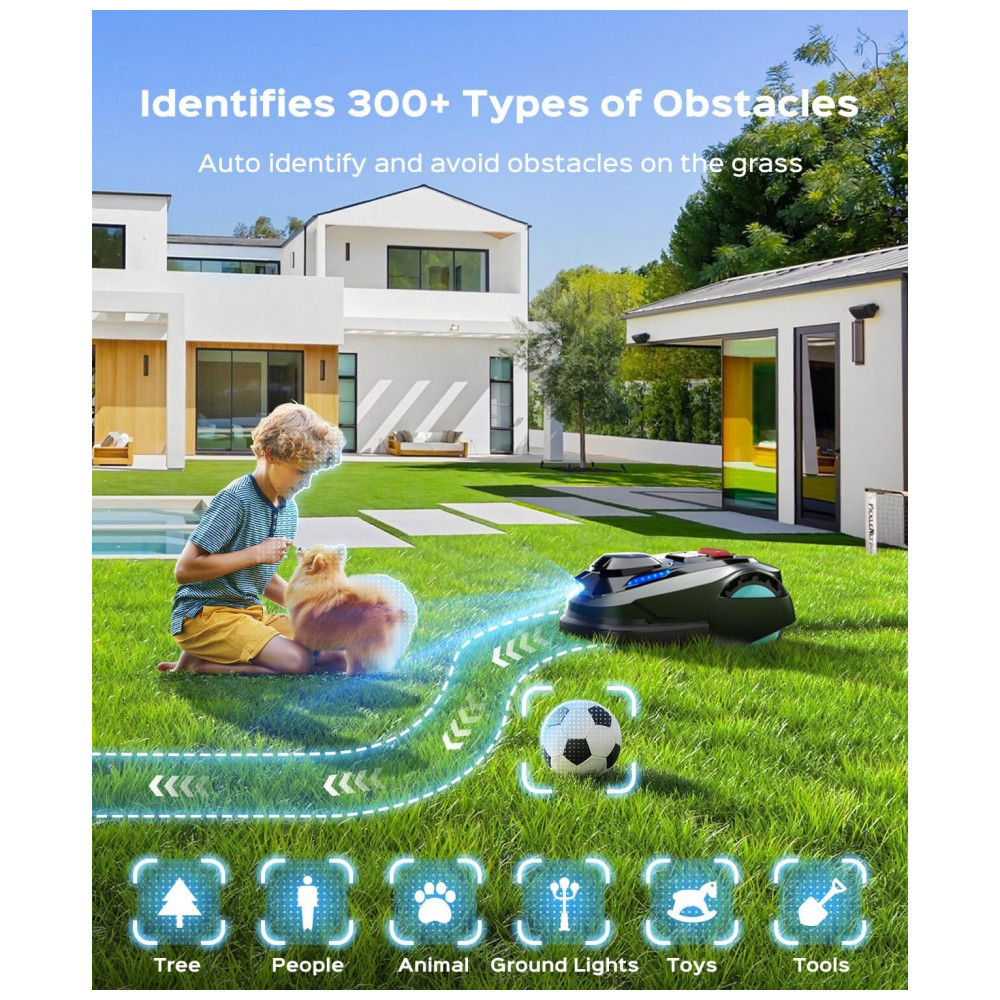 Controle inteligente pelo APP permite programar horários de corte, ajustar modos e monitorar o progresso em tempo real pelo smartphone, com retomada automática após recarga para operação ininterrupta. O sistema de detecção de obstáculos 3D identifica mais de 300 tipos de objetos, garantindo navegação segura em terrenos irregulares, móveis de jardim e inclinações de até 20°.