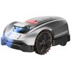 Bateria de alta capacidade oferece até 100 minutos de autonomia com recarga em 70 minutos, classificada IPX6 para resistência a intempéries. Inclui 24 lâminas de reposição para manutenção prolongada da lâmina de corte de 20 cm com mulching. Design em plástico cinza suporta operação automática em condições variadas.